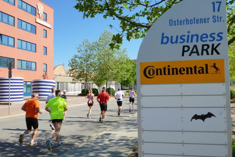 Jetzt geht’s rund, das lese ich auf der Einfahrt des Systemprüfkurses der Firma Continental. Wir dürfen auf die Teststrecke. Ein Zutritt ist normalerweise streng untersagt. Aber dafür, dass jeder Laufveranstalter Sponsoren braucht, die nicht nur Dienstleistung und Konsumprodukte liefern, sondern auch Kapital, ist es bestimmt ein Agreement, dass der Kurs auf diese Strecke gelegt wird. Ich finde das einzigartig, denn wo darfst du auf eine Rennstrecke? Am Hockenheimring und auf dem Nürburgring darfst du laufen, aber wo anders? Eigentlich werden hier Autos, Bremsen und Fahrwerke getestet. Manchmal findet dort ein Rad- oder Inlinerrennen statt. Doch heute sind die Läufer am Zug.