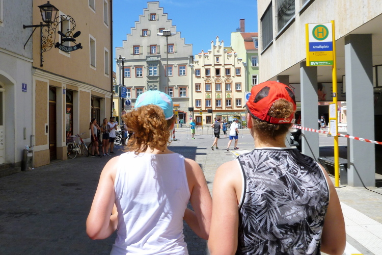 Der Haidplatz, nächster Höhepunkt beim Lauf durch das Weltkulturerbe. Was sehen wir? Den barocken Justitiabrunnen in der Mitte (aus dem Jahr 1656), das Thon-Dittmer-Palais (heute ist hier die VHS, ein Kino, die Stadtbücherei und das Deutsch-Amerikanische Institut untergebracht) und die Neue Waag, die heute Sitz des Verwaltungsgerichtes ist. 1541 fanden hier Religionsgespräche zwischen Philipp Melanchthon und Johannes Eck statt. Am Westausgang des Haiplatzes liegt die Patrizierburg Goldenes Kreuz, heute ist da das gleichnamige Hotel untergebracht.