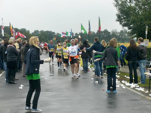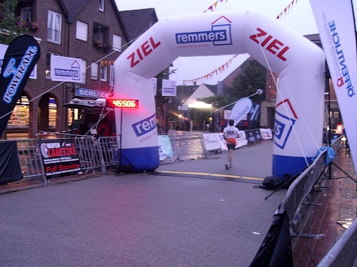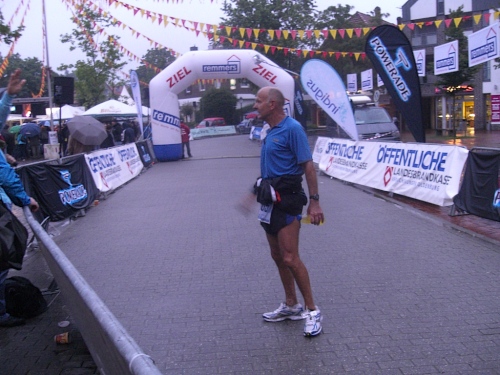 Bei Kilometer 41 gibt es im Halbdunkel ein Blitzlichtgewitter, denn hier stehen die offiziellen Fotografen und knipsen, was das Zeug hält. Der Regen hat jetzt kurz vorm Ziel aufgehört. Ich laufe nach 4:54:45 durchs Ziel und empfange meine Medaille. Kurz danach gibt es die Versorgung und ich freue mich auf das erste alkoholfreie Bier. Danach die Tasche holen, warm anziehen und ab zur Sporthalle. Hier dusche ich ausgiebig mit herrlich heißem Wasser, warm anziehen und ab auf den Markplatz.