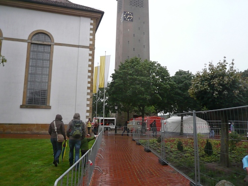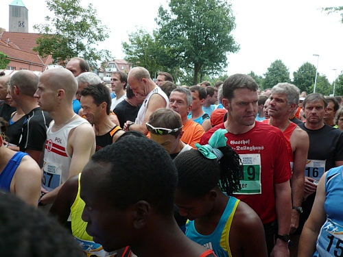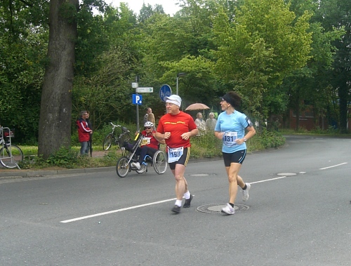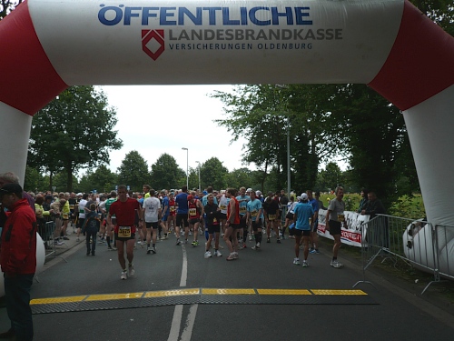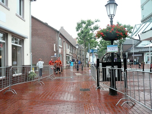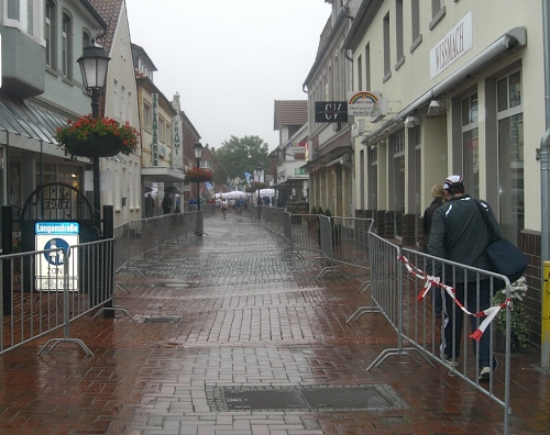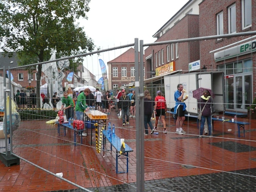An der Hasestraße biegen wir ab in die Stadt. Über die Langenstraße kommen wir ins Zentrum, werden aber vor dem Marktplatz umgeleitet, so dass wir nicht durch den Zielbogen in die zweite Runde laufen. Wir kommen hinter dem Ziel neben der Zielversorgung nach einer Schleife wieder auf die neue Runde. Die Straßen sind nass und es regnet weiter. Hier in der Umleitung ist keiner am Straßenrand aber den Zielsprecher hören wir aus der Parallelstraße.