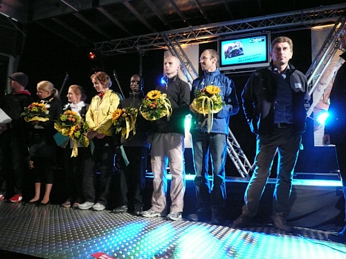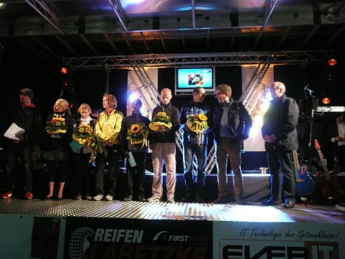 Hier angekommen, beginnt gerade die Siegerehrung der 3 schnellsten Männer und Frauen vom Marathon. Obwohl noch alles nass ist und es langsam kühl wird, ist der Platz voll. Heute geht Marco Diehl leer aus, denn er erreicht den 4. Platz, bleibt aber mit 2:37:03 wieder in seinem Zeitrahmen.