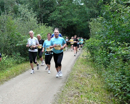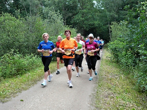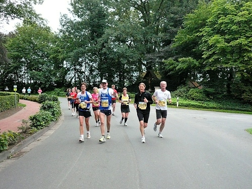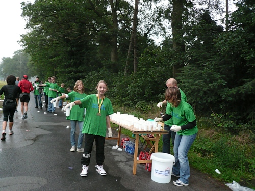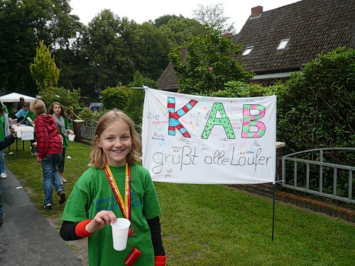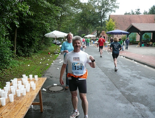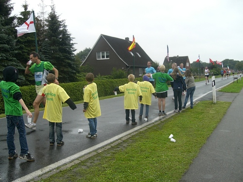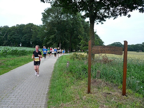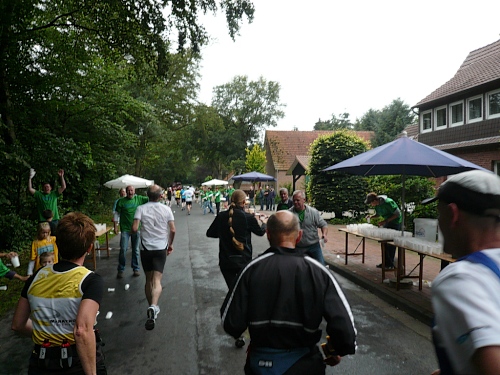 Bei km 3 geht es am Waldrand entlang nach Werwe. In altfriesischen Gesetzbüchern taucht das Wort „Warf“ mehrfach auf, was Gericht oder Gerichtsstätte bedeutet. Die heutige kleine Wohnsiedlung war früher das Gogericht für die Landgemeinden von Löningen. Seit alten Zeiten gehörte fünf Bauern in Werwe der Grund und Boden, die noch heute der Kern des Drubbels sind. Von den später sieben dazu gebauten Heuerhäusern stehen heute noch drei. Hier gibt es schon wieder eine Getränkestation. Viele Kinder und Jugendliche sind sehr engagiert bei der Sache.