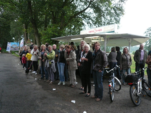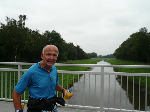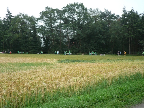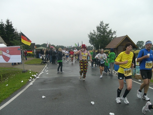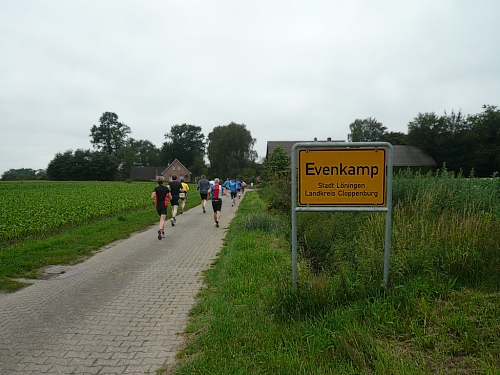 Wir verlassen den Ort Richtung Evenkamp. Kurz hinter dem Ort sieht man links im Korn ein Großsteingrab von ca. 1,80m Innendurchmesser. Nur knapp einen Kilometer weiter erreichen wir den Ort und schon am ersten Haus stehen die Anwohner und jubeln uns laut zu. Auf der anderen Straßenseite sitzen Anwohner und feiern uns. Dann geht es um die Ecke und vor der Dorfkneipe feiern uns die Gäste, ohne jedoch die Bierflasche aus der Hand nehmen. Gleich nebenan gibt es ein Fest mit Bierpilz. Wir werden frenetisch angefeuert. Man spürts, die Leute haben ihre Freude. Ich rufe ihnen zu: „Durchhalten, wir kommen wieder“. Noch im Ort hinter der nächsten Kurve sind einige vom Schützenhutclub mit lauter Musik, die uns feiern. Aber noch bevor wir den Ort verlassen, gibt es schon wieder eine Versorgungsstation, wo uns das Personal weiter anfeuert. Es ist einfach toll, was die hier auf dem platten Land für diese Veranstaltung tun. Hier wird richtig gefeiert. So viel Begeisterung habe ich wo anders noch selten erlebt. Jetzt verstehe ich auch, warum hier so viele Wiederholungstäter gibt.