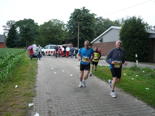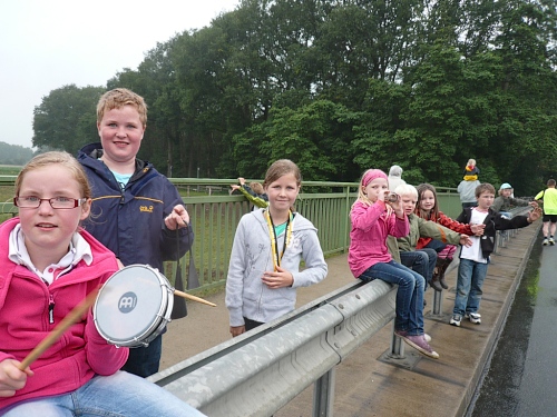 Wir laufen bei km 10 an Winkhof und bei km 11 bei Wienöbst vorbei. Hier liegen verstreut die Höfe zwischen den Feldern. An einem Knick steht ein Zelt an der Strecke, in der eine Gruppe Kinder Musik macht. Toll, einfach toll. Jetzt wird der Regen stärker und es geht an der Straße entlang, die für uns einseitig gesperrt ist. Den Radweg daneben kann man auch benutzen. Aber es kommt ja nur so alle 5 Minuten ein Auto entgegen.