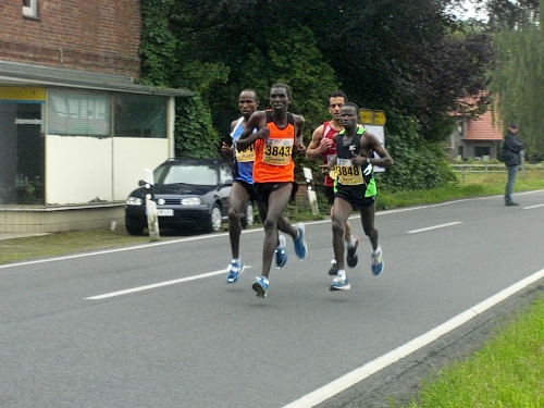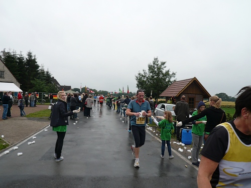 Bei km 8 erreichen wir Ehren, was auch der südlichste Punkt der Strecke ist. Wir befinden uns hier in einer herrlichen idyllischen Landschaft. Neben uns galoppieren die Pferde auf der Weide, wohl durch uns Läufer angesteckt. Aus dem Nieseln wird langsam Regen. An einer kleinen Kapelle am Wegesrand stellen sich Zuschauer unter.