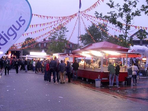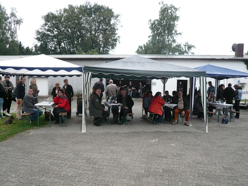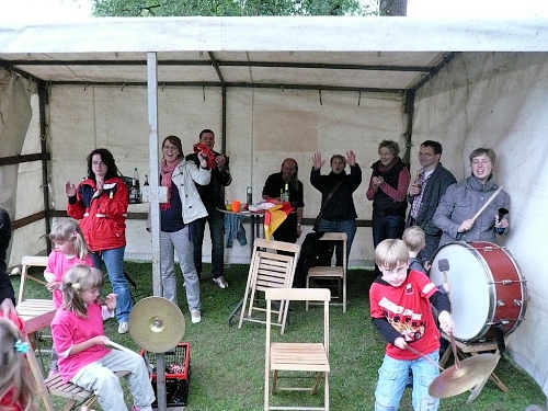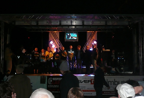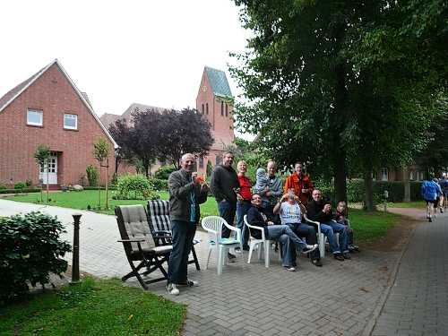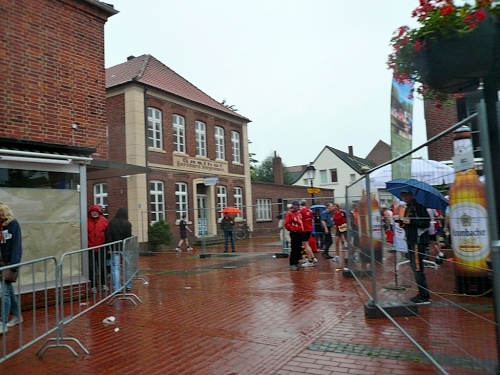 Nach einem Stück sind wir in Löningen „Auf der Hüe“. Hier findet eine Marathon-Party der VFL - Handballer mit Moderator Jörn Willen und der Band "once more" statt. Obwohl es regnet ist hier eine Superstimmung. Man staunt, dass ich Zeit für Fotos habe.
