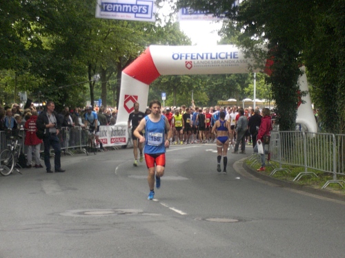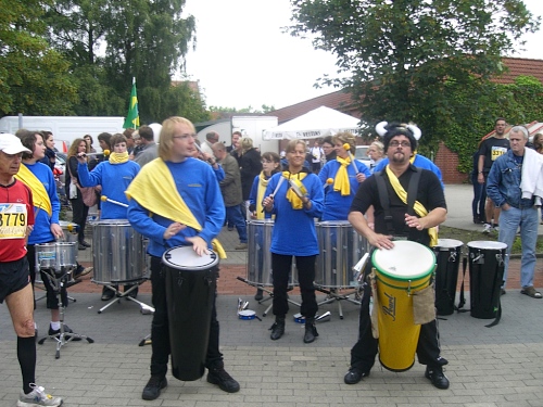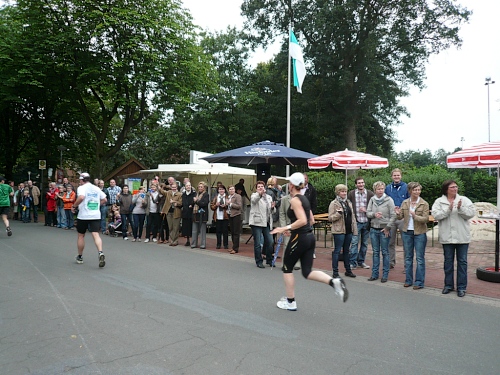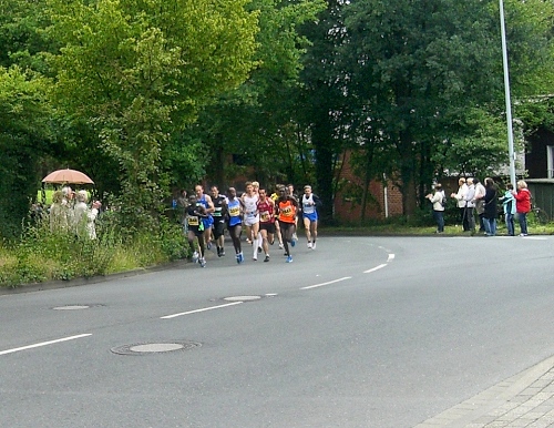 Wir kommen ans Haseknie und biegen von der Hauptstraße ab. Geradeaus wären wir nach 1km im Ziel, aber wir müssen noch eine 7,5km lange Schleife laufen. Direkt hinter dem Knick ist die Staffelübergabe und natürlich wieder ein Stimmungsnest. Hier spielt die Rockband „Wild Rogues“ aus Münster.