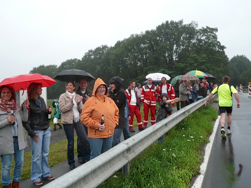 Jetzt sind wir rund 2km allein mitten in der Natur. Es geht vorbei an blühenden Kartoffelfeldern und an Getreidefeldern, die von herrlichen Mohnblumen eingerahmt werden. Es geht nach Röpke. Man sieht schon von weitem die aufgereihten Tische, an denen wir im Regen bestens versorgt werden. Es geht weiter zur Schelmkapper Brücke an die L74. Hier stehen Dirk Schelze mit der SG Boen und einige Trommler, die uns anfeuern, als wäre das bei diesem Mistwetter das normalste der Welt.