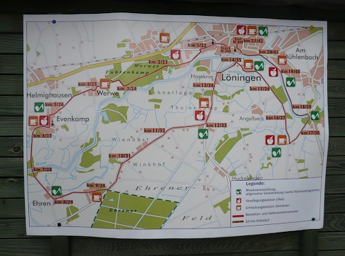 Jetzt fängt es an zu nieseln, ich verlasse den Ort über den Ehrener Kirchweg. Ich bin erstaunt, wie viel kleine Wäldchen bzw. Schonungen es entlang der Laufstrecke gibt. Bei km 7 überqueren wir das Flüsschen Hase. Die Hase ist ein 169 km langer Nebenfluss der mittleren Ems, die über die Else in die Weser mündet. Der Name hat nichts mit dem Tier zu tun, denn die frühere Schreibweise Haase kommt aus dem germanischen was soviel wie Grau heißt. Die Benennung eines Flusses nach der Farbe war früher üblich.