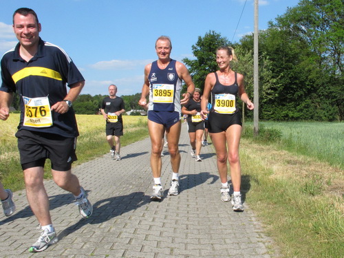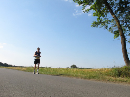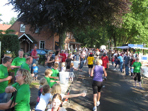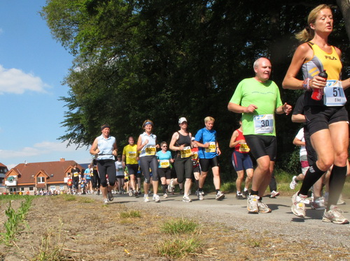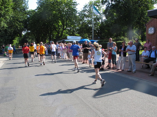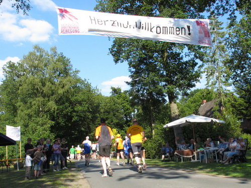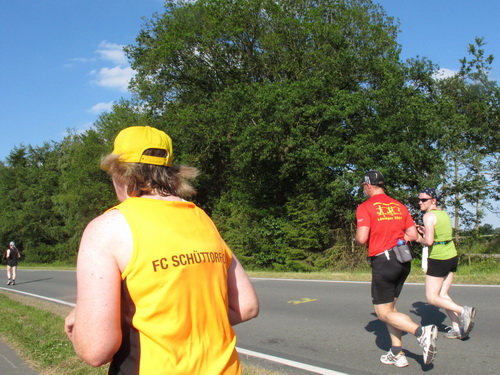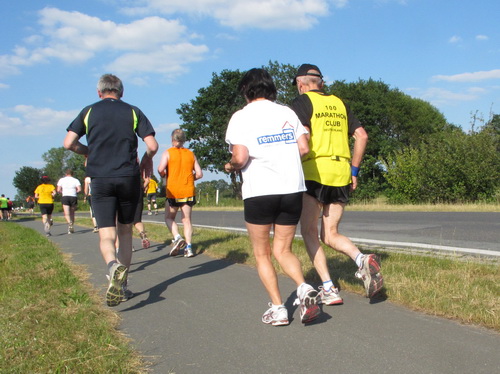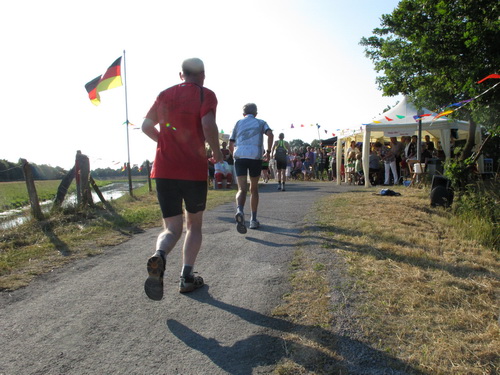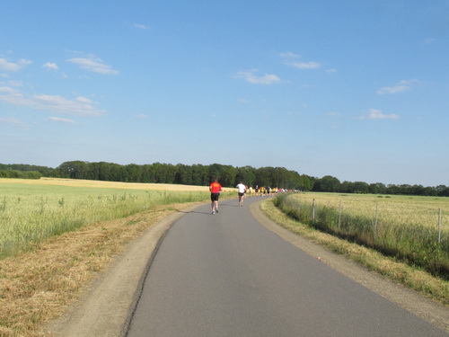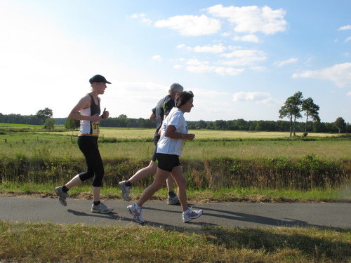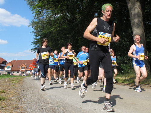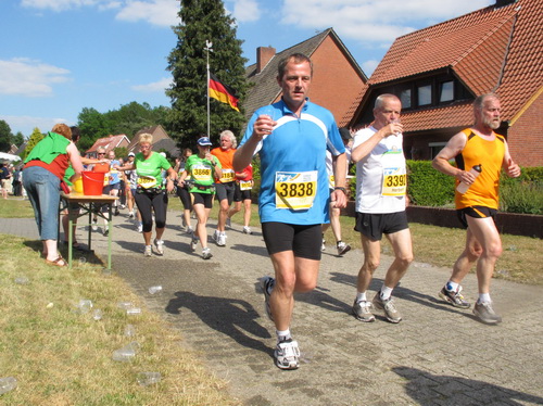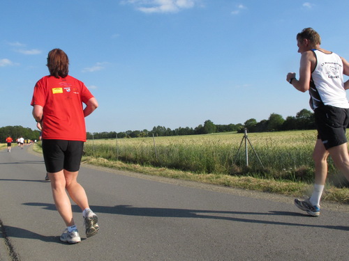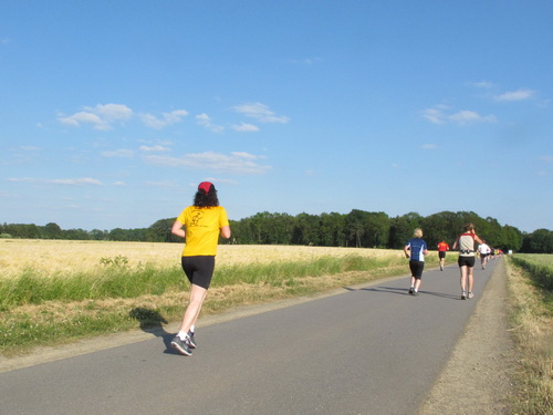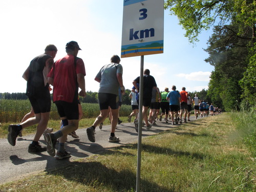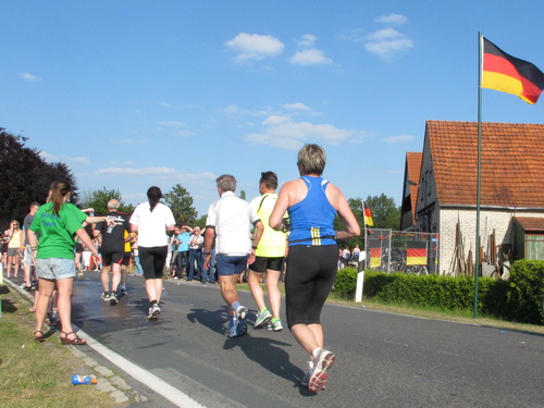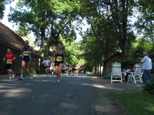 17.00 Uhr – geschafft, es geht los. Über 1000 Läuferinnen und Läufer (800 „Halbe“ und Staffelläufer und ungefähr 200 Marathonis) gehen auf die Strecke, aber bis auf die Ambitionierten in den ersten Reihen, langsam und ohne Hektik. Erstaunlich viele Zuschauer lassen uns spüren: „Schön, dass Ihr da seid.“ Und: „ Ihr seid die Größten.“ Mit geschwellter Brust geht es ein kurzes Stück durch den Ort. Nach 15 Minuten gemütlichem Jogging in praller Sonne kommt schon die erste Getränkestelle und dann ein kleines, schattiges Waldstück, genannt Werwer Fuhrenkamp.
