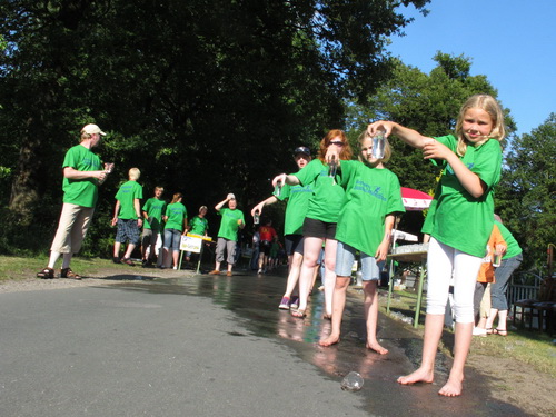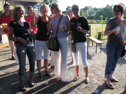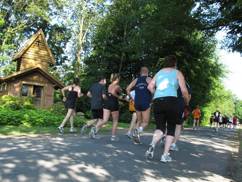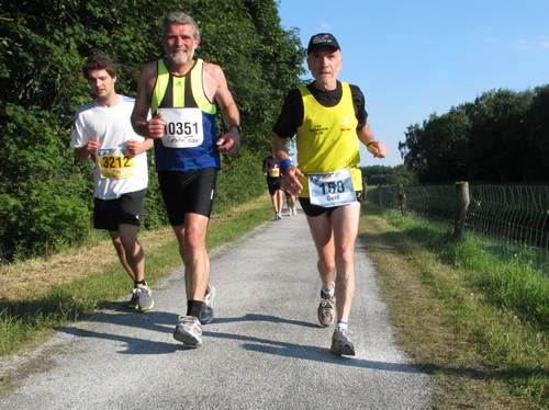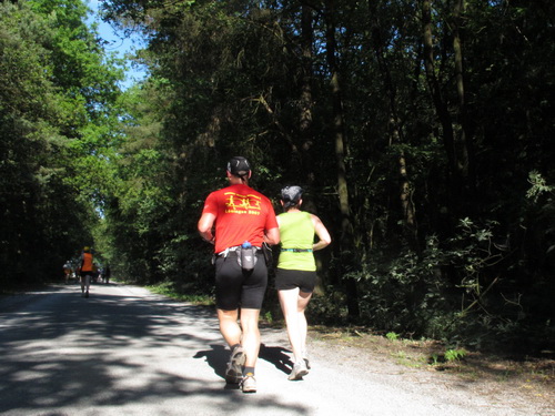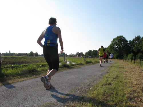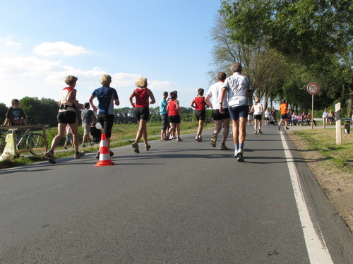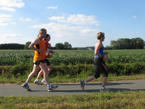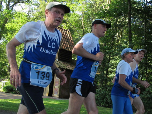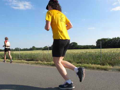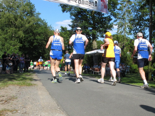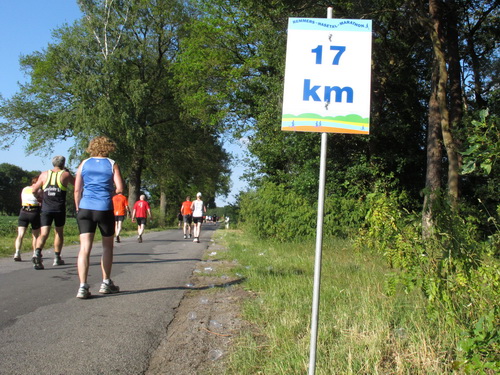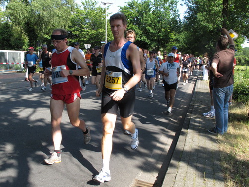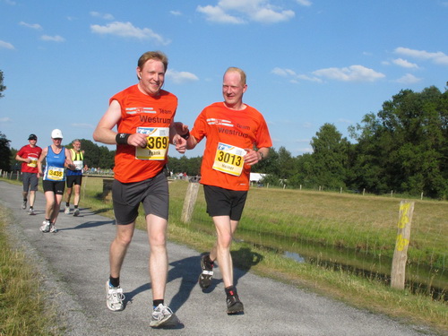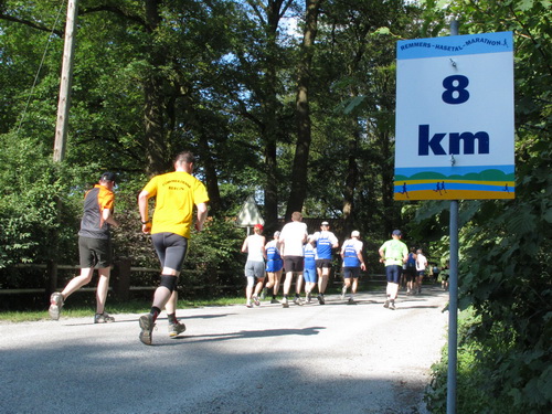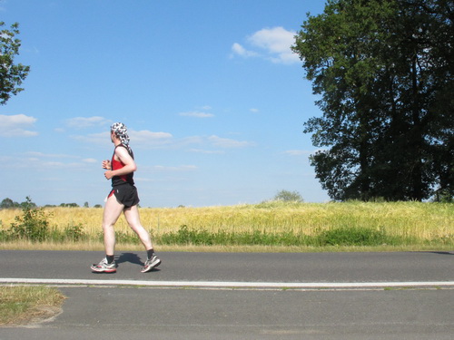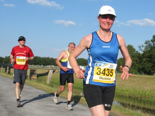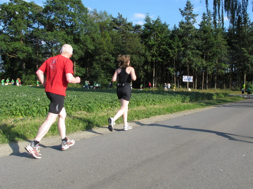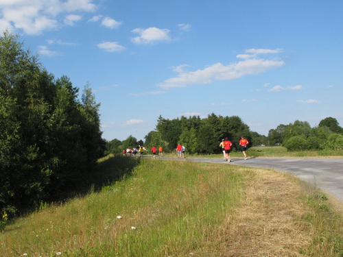 17.00 Uhr – geschafft, es geht los. Über 1000 Läuferinnen und Läufer (800 „Halbe“ und Staffelläufer und ungefähr 200 Marathonis) gehen auf die Strecke, aber bis auf die Ambitionierten in den ersten Reihen, langsam und ohne Hektik. Erstaunlich viele Zuschauer lassen uns spüren: „Schön, dass Ihr da seid.“ Und: „ Ihr seid die Größten.“ Mit geschwellter Brust geht es ein kurzes Stück durch den Ort. Nach 15 Minuten gemütlichem Jogging in praller Sonne kommt schon die erste Getränkestelle und dann ein kleines, schattiges Waldstück, genannt Werwer Fuhrenkamp.