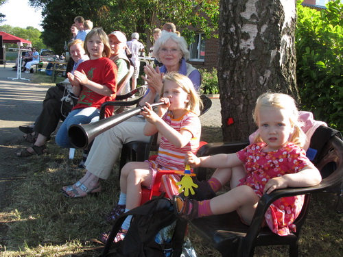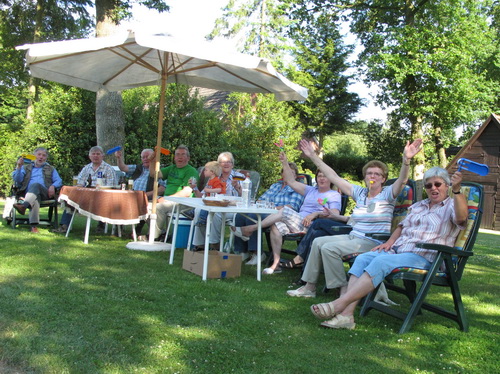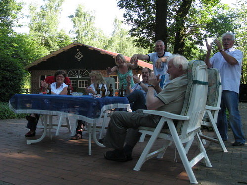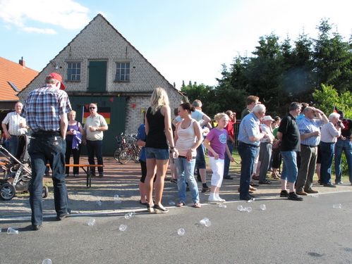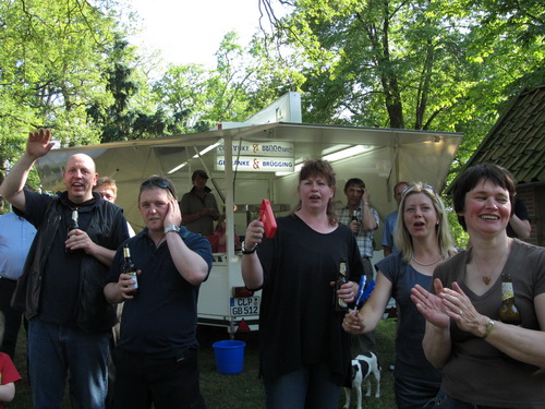 Nur aus ein paar Häusern besteht das Örtchen Werwe. Viel mehr Leute, als jetzt an der Straße stehen oder im Garten sitzen und klatschen, wohnen hier bestimmt nicht. Es gibt schon wieder was zu trinken. Der nächste Ort ist Evenkamp nur einen Kilometer entfernt und etwas größer. Und lauter, viel lauter. Mit Kind und Kegel und Live-Musik feiert man ein richtiges Straßen- und Heckenfest. „Was ist los bei Euch, kein Fußball heute?“, frage ich eine Stammtischrunde. „Nö, heute ist Marathon!“ kommt’s fast im Chor.