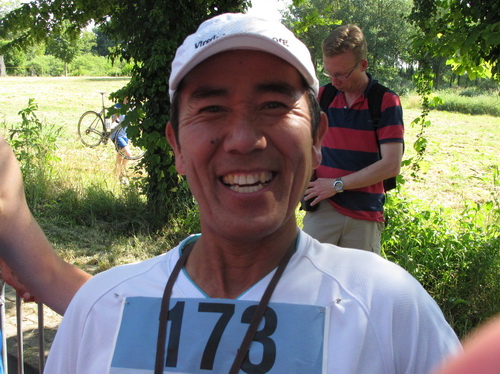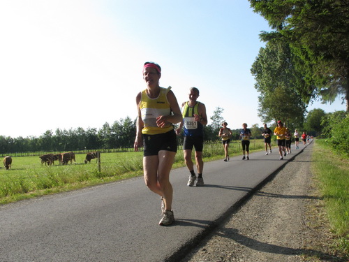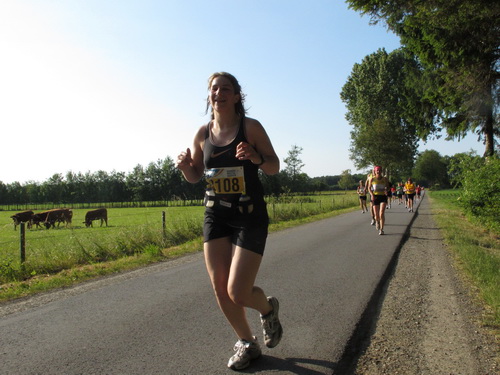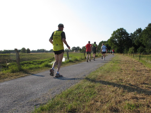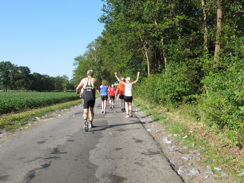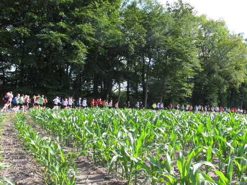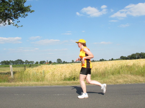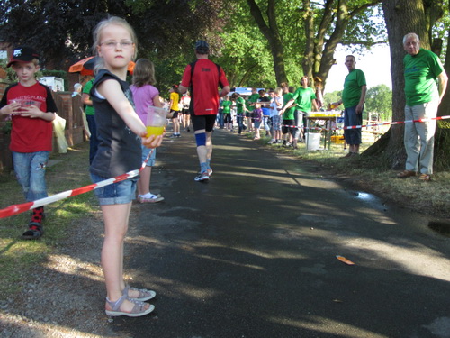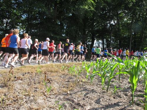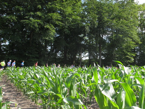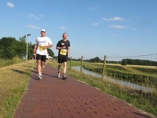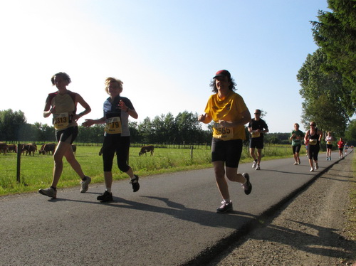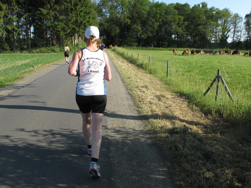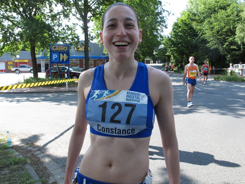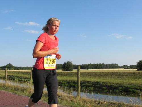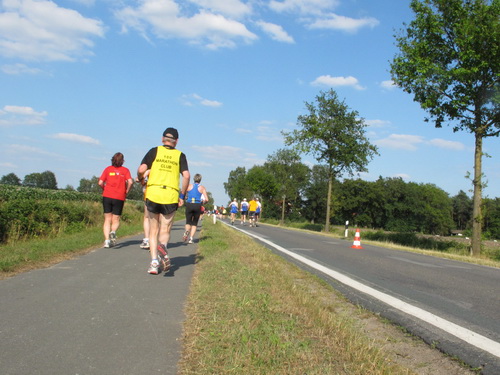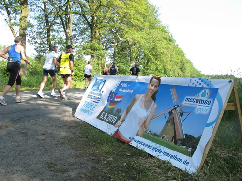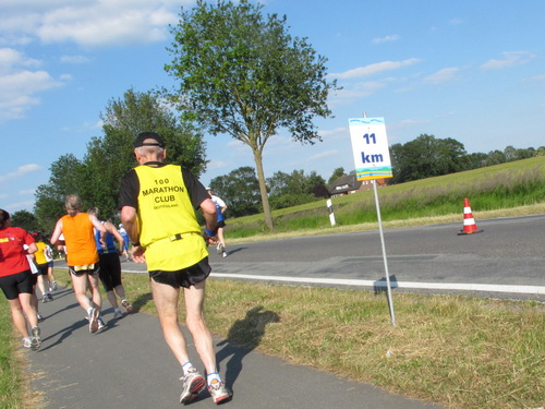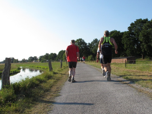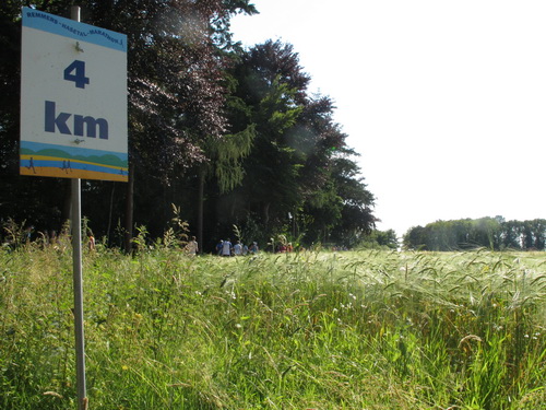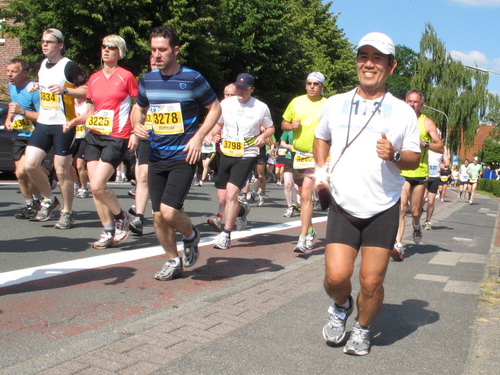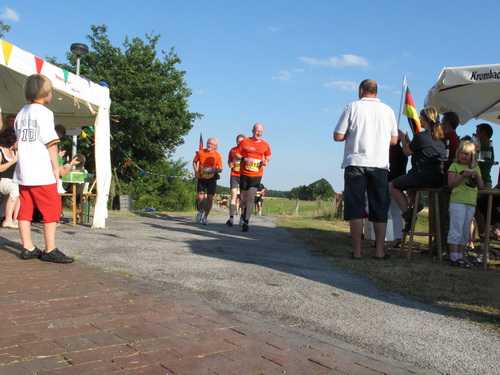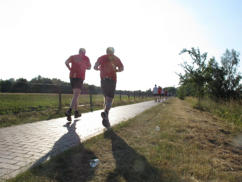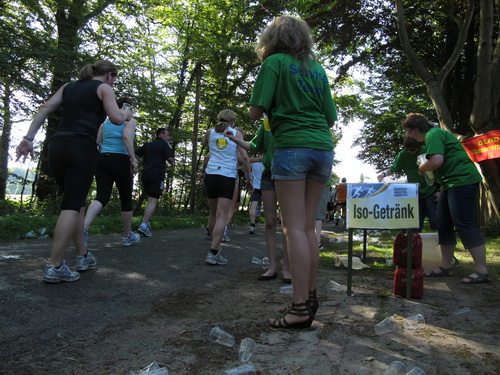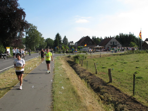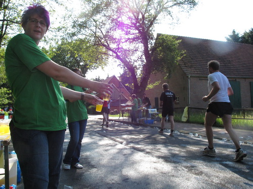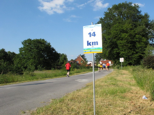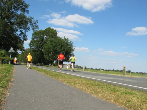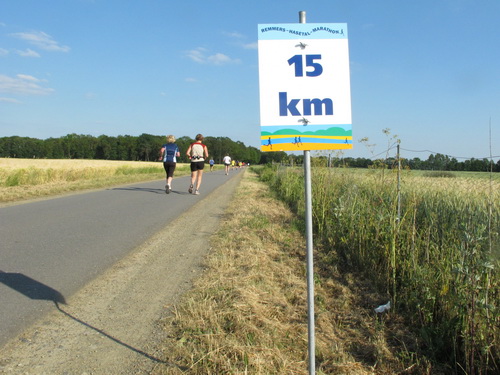 Gerade sechs Kilometer gelaufen und schon wieder gibt es Essen (Bananen, Äpfel) und Trinken (Wasser, Iso, Cola). Wer da nein sagt, muss es vielleicht büßen. Der Schweiß fließt in Strömen. Ein kleines Wäldchen spendet etwas Schatten, dann geht es bei km 7 über das Flüsschen, das dem Lauf den Namen gibt: die Hase. In der Nähe von Osnabrück ist die Quelle, in Meppen die Mündung in die Ems.