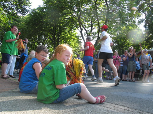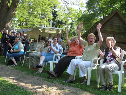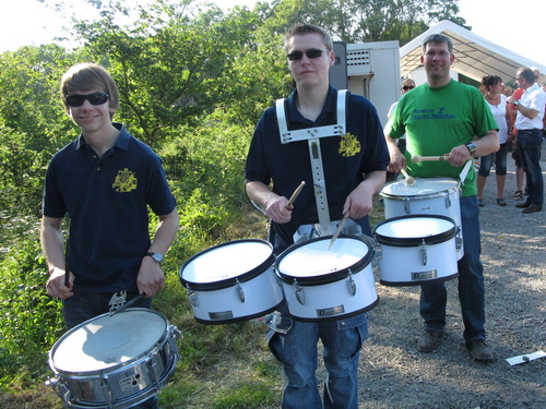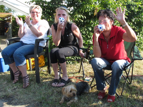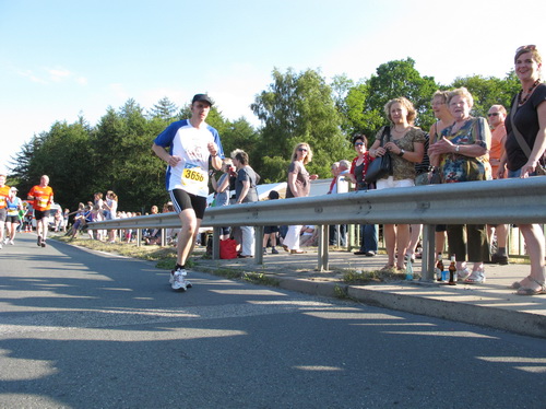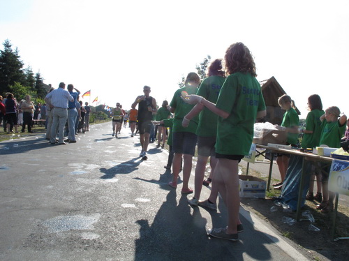 Ein Kilometer weiter stehen um einen fahrbaren Tresen garantiert mehr Leute, als im Umkreis von drei Kilometern wohnen. Während sich die meisten Männer an einer Bierflasche festhalten, übernehmen die Frauen das Klatschen und Rasseln. Tolle Stimmung hier in Ehren (km 8). Nur ein paar Minuten weiter das gleiche Bild: nur drei Häuser, aber 30, 40 Leute sitzen unter Sonnenschirmen oder in schattigen Zelten und feiern die Läufer. Und wenn ich den Fotoapparat raus hole, legen sie noch einen Zahn zu. Super, Leute.