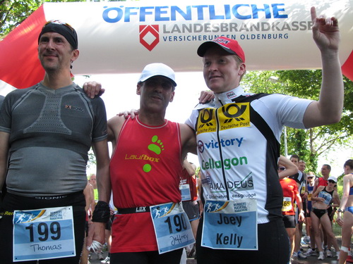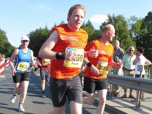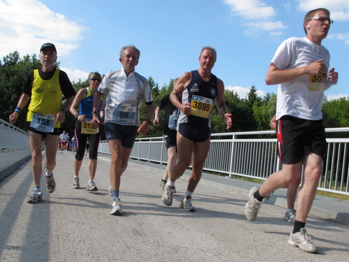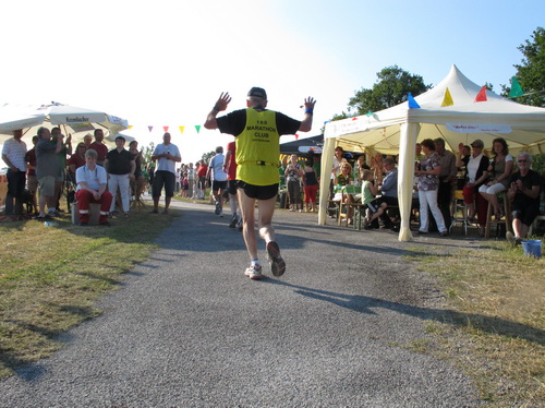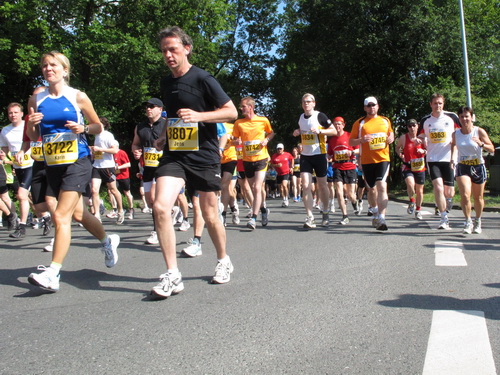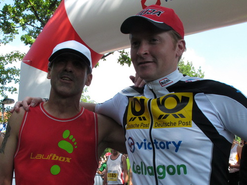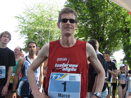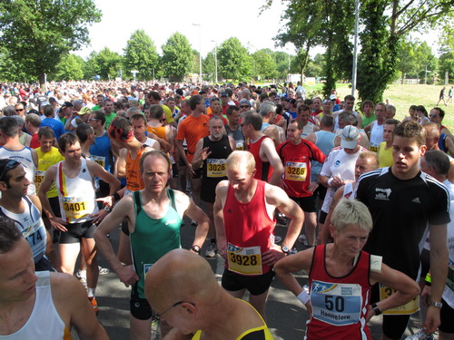Ich denke an meinen ersten eigenen Marathon, 2002 in Berlin. Ich kannte keinen einzigen Menschen, war der einsamste Mensch unter 30.000 Marathonläufern. Hier bin ich heute einer von 200 und kenne fast jeden. Na ja, zumindest bin ich dauernd mit jemanden am Quatschen und wenn meine Frau mich nicht daran erinnern würde, dass es Zeit wird, müsste ich ohne Chip und Startnummer loslaufen. Davon habe ich auch schon mal geträumt.