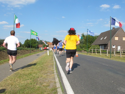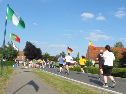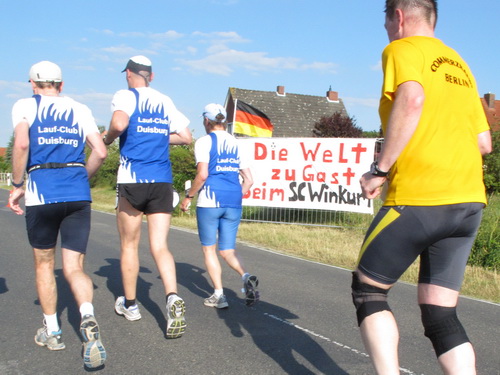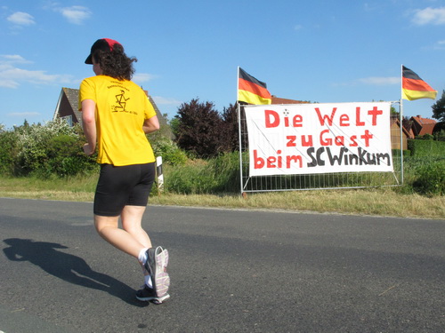 Den Schwung braucht man auf den nächsten drei Kilometern. Es geht auf einem Radweg parallel entlang der Verkehrsstraße. Rechts und links Getreidefelder, eingestreut mal ein Bauernhof, über uns blauer Himmel, ein paar harmlose Wolken, das ist alles. Schatten gibt es nicht. Man könnte auf die Idee kommen, sich die zweite Runde zu schenken. Dann hört man aber schon den Sprecher des SC Winkum und den Jubel einer offensichtlich großen Zuschauermenge. Rechts und links der Straße wehen die Flaggen der Teilnehmerländer an der Fußball-WM. Aber mit Fußball hat das hier nichts zu tun. Wie wurde mir vorhin Bescheid gegeben? „Heute ist Marathon!“