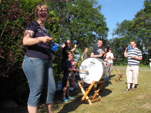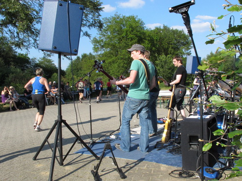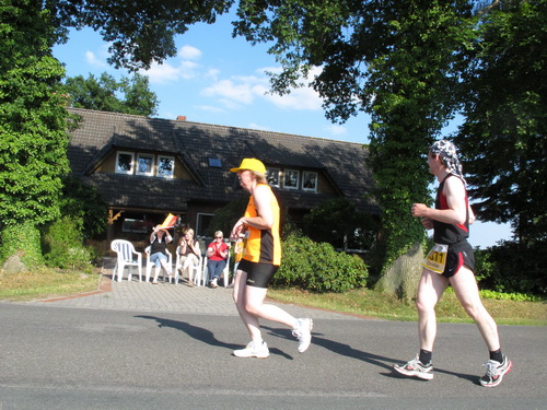 Bei Kilometer 13 rocken The Wild Rogues und die Staffeln wechseln ihr Personal. Wir verlassen die Straße nach rechts und laufen auf dem Sackmoorweg weiter. Schlagermusik und eine tolle Stimmung gibt es dann auf der Marathon-Party der Handballer (km 14). Selten habe ich bei einem Landschaftslauf ein solches Publikum erlebt. Es wird echt Zeit, dass darüber mal gesprochen wird.