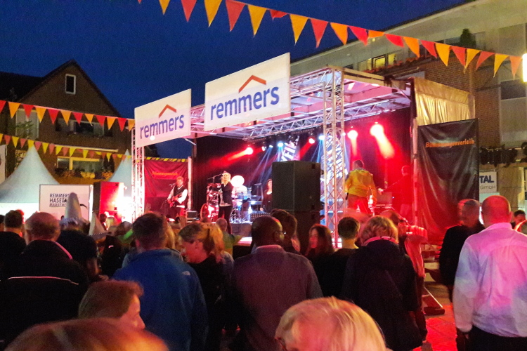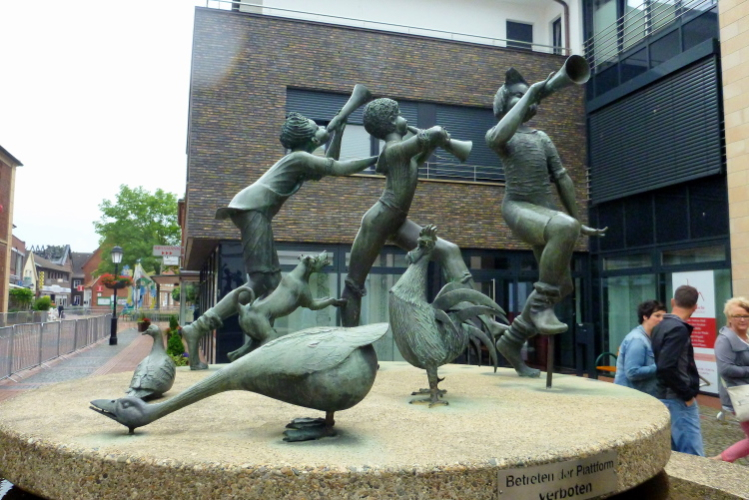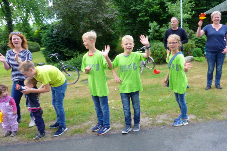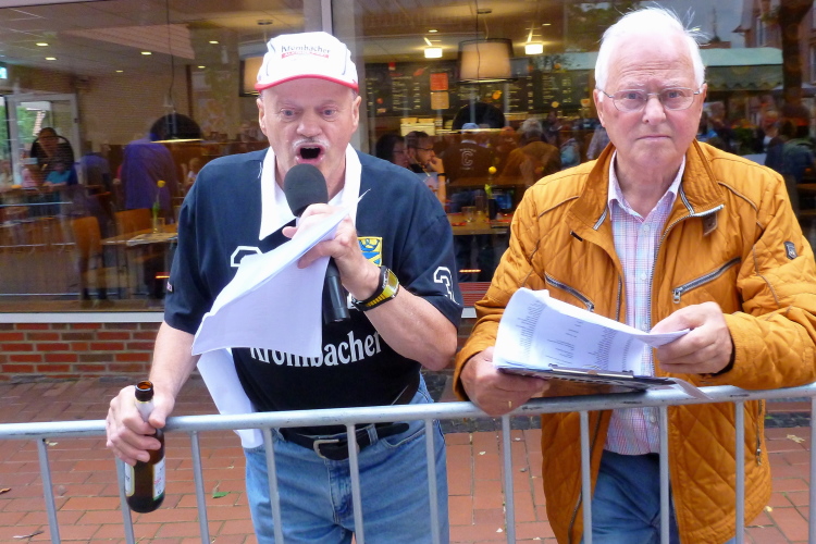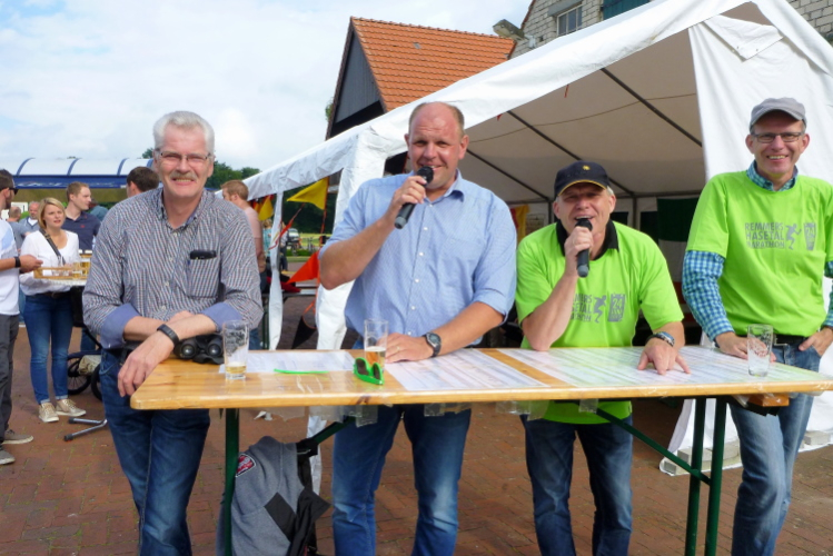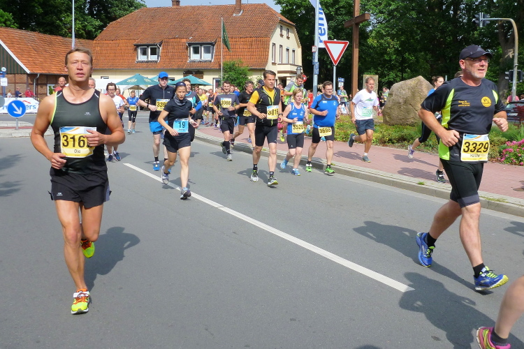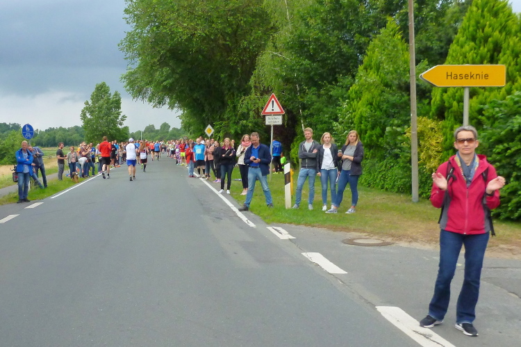 Nach guten 5 km durchqueren wir Evenkamp, das ebenfalls zu Löningen gehört und einige zu den insgesamt gut 13.000 Einwohnern beisteuert. Hier spornt uns neben etlichen Fans an der Strecke die örtliche Musikkapelle an und der Sportverein versorgt uns, unterstützt von zwei rührigen Moderatoren, mit Flüssigem. Exakt nach 7 km überqueren wir die namengebende Hase, ein Flüsschen, von der Größe mit unserer heimischen Wied vergleichbar. Sie entspringt im Teutoburger Wald und mündet nach 170 km bei Meppen in den Dortmund-Ems-Kanal. Der Name hat allerdings nichts mit dem Mümmelmann zu tun, wie ich lerne, sondern leitet sich von einem alten Wort für „grau“ als Farbe des Wassers ab. Einen km weiter queren wir den Stadtteil Ehren, in dem die KAB, die Katholische Arbeitnehmerbewegung, hingebungsvoll für Stimmung und Flüssigkeitsnachschub sorgt.