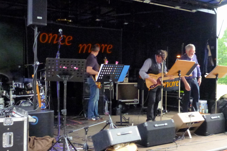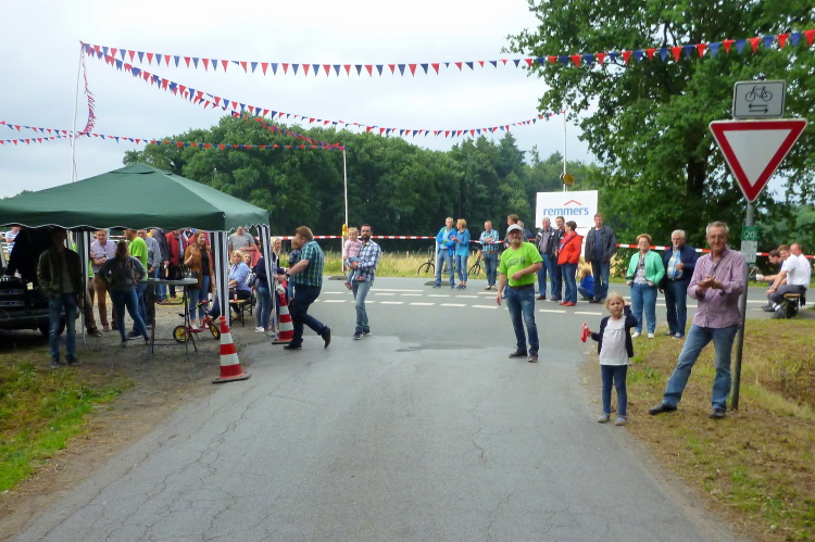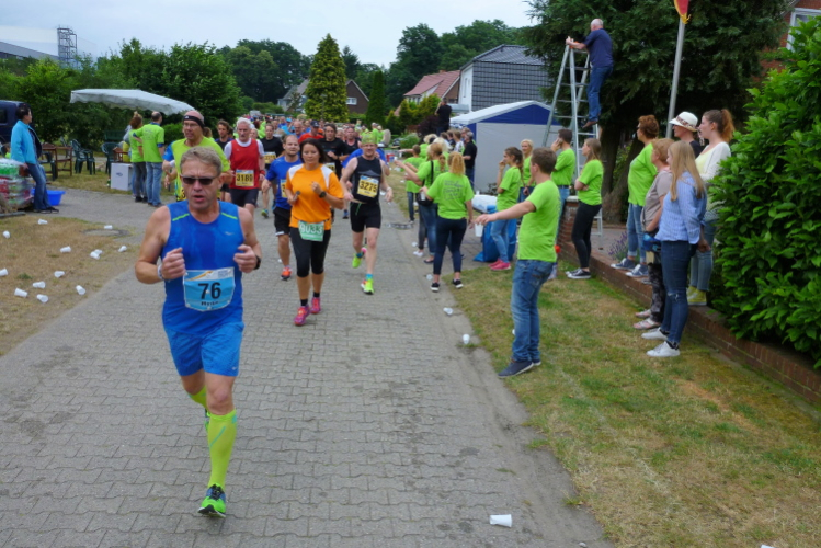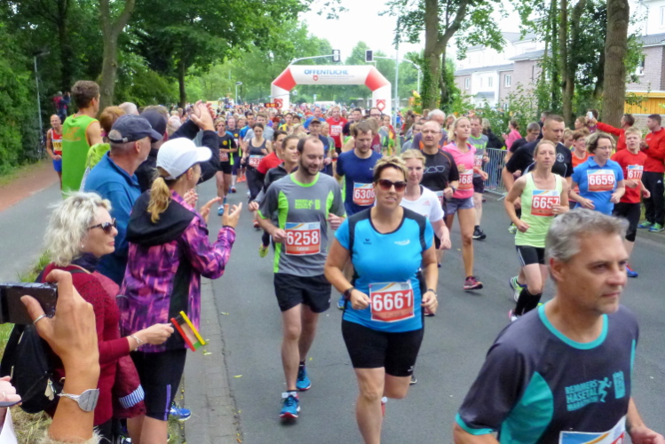 Im sog. überhäsigen Viertel, im Süden Löningens, jenseits der Hase, befinden wir uns jetzt, und exakt an dieser Stelle hat der erste Staffelläufer ausgehoppelt und übergibt hoffentlich nicht sich, aber den Staffelstab. An der Straße „Auf der Hüe" feuern die VfL-Handballer mit Moderator Jörn Willen an. „once more“ heißt die Band, die an dieser Stelle die musikalische Begleitung übernommen hat, aber der Name ist – zumindest für mich – nicht Programm: Für „nochmal“ müßte man zumindest überhaupt erstmal gespielt haben, bei meinen beiden Vorbeiläufen ist leider Ruhe angesagt. A propos meinen: Meine Begleiter vom Anfang haben sich recht schnell nach vorne verdünnisiert, durch mein ständiges Fotografieren laufe ich einfach zu unstet. Bevor wir in die Stadtmitte zurückkehren dürfen, ist noch eine weitere Ehrenrunde südostwärts von Löningen zu drehen. Die führt uns an Angelbeck vorbei und ist auf sieben km identisch mit dem 10 km-Kurs.