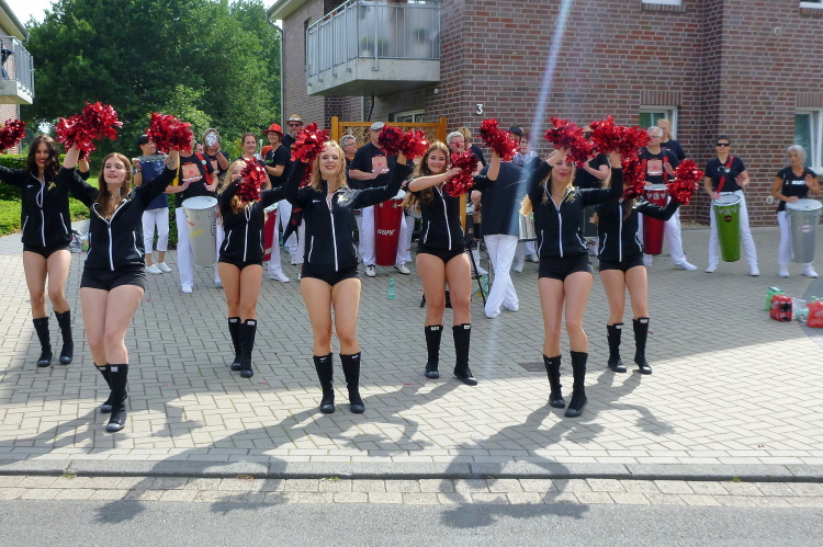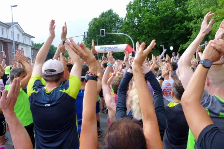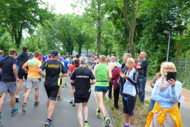 Einen musikalischen Motivationsschub entlang der gesamten Strecke hat man uns versprochen, und der geht mit der Bersenbrücker Sambaband „Samba Landaya“ am Start auf der Südtangente am K+K-Markt auch direkt los. Und weil die Mädels durchaus lecker sind, strahlt direkt die Sonne zwischen Wolkenlücken hervor. Der Temperatursturz von vorgestrigen 37 Grad am Rhein auf hier und jetzt 17 ist schon heftig, da tun ein paar Wärmestrahlen richtig gut. Zahlreiche Zuschauer begleiten uns optisch sowie akustisch auf den ersten Metern und über eine Ausfallstraße mit netten, regionstypischen Einfamilienhäusern erreichen wir nach gerade einmal 1,2 km die erste von zahlreichen Verpflegungsstellen, von einer Percussionband unterstützt . Auf der zweiten Runde wollte ich sie eigentlich gezählt haben, habe das aber dann doch aus den Augen verloren. Egal, deren Dichte ist definitiv beispiellos.