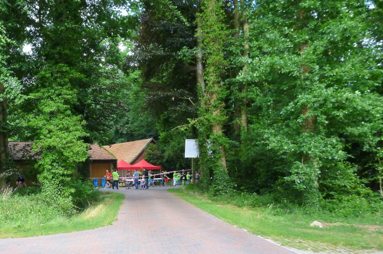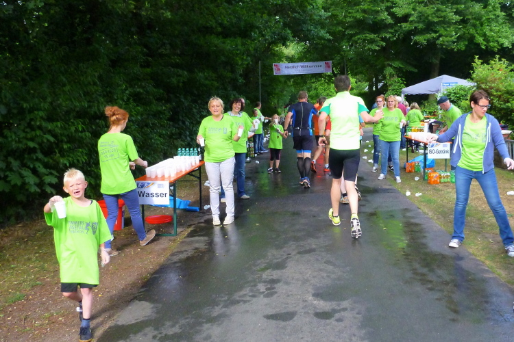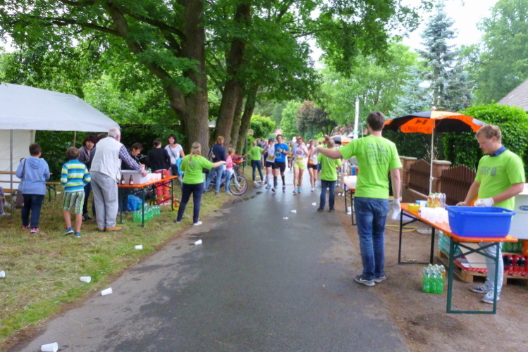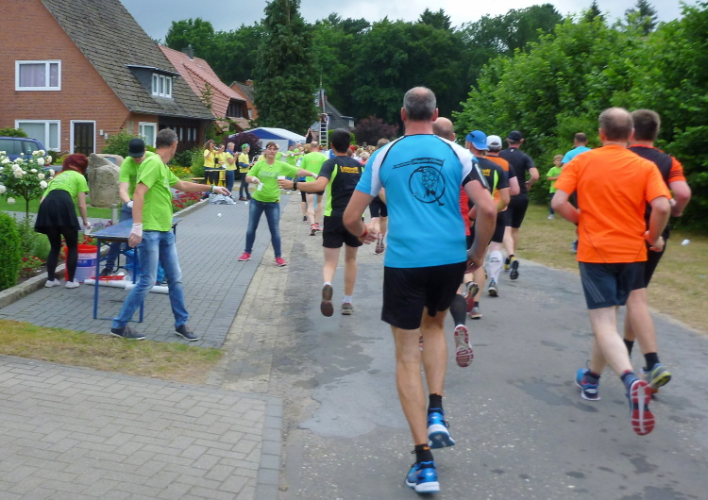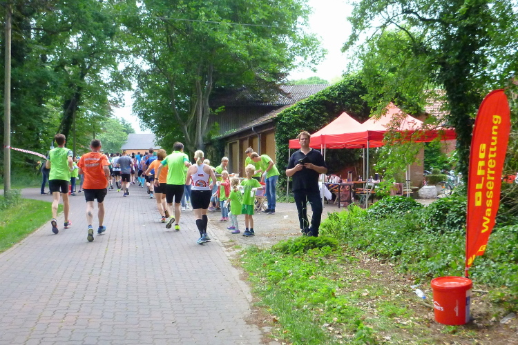 Wir tauchen in ein kleines Waldstück ein, auf dessen Sand-/Kiesboden wir gut vorankommen. Auch hat sich die anfängliche Dichte der Läufer bei am Start vermutlich an die tausend Marathon-, Halbmarathon und Staffelmarathonläufer gegeben, es ist genug Platz vorhanden. Nach gut drei km und Umrundung eines großen Feldes befinden wir uns auf dem Werwer Weg – wobei sich die Löninger offensichtlich nicht entscheiden können, ob es der Werwer (mit ww) oder der Werver Weg (mit wv) ist, beide Bezeichnungen wechseln, auch auf der Internetseite, mehrfach. Dem Spaß und der Stimmung im Ortsteil Werwe (ich entscheide mich fürs Doppel-w) nach dreieinhalb km Richtung Südwesten tut das aber keinerlei Abbruch und der engagierten Streckenmoderation schon überhaupt nicht. Nach knappen 4 km steht die DLRG Löningen und rettet uns nicht aus dem, sondern mit Wasser & Co.