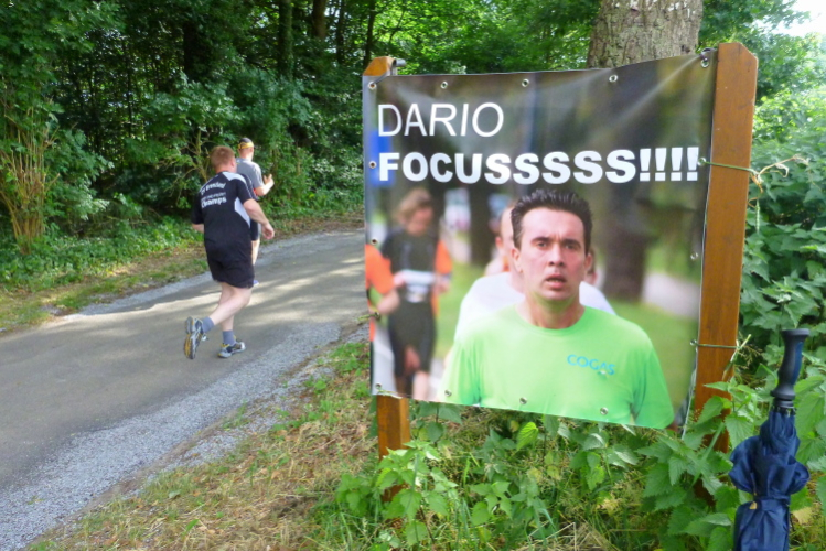 Die Masse unseres Lauftreffs tritt über die 10 bzw. 5 km an, so können wir zunächst Verbliebene erst einmal als Fans mit unserem nagelneuen Banner aktiv werden. Doch bald ist es auch für uns soweit: Mit mir als Zwei-Runden-Läufer starten über die Halbmarathondistanz Tobi, der zwar keine Prognose abgeben möchte, aber ganz bestimmt unter 1:45 Std. bleiben wird, Harald als Ersttäter mit Ziel 2:15 Std. und Andre. Letzterer sieht diesen Lauf als letzte notwendige Bestätigung, erstmals ins gezielte Marathontraining für Köln einsteigen zu können und sollen; vom Königsforst-Halbmarathon im März hat er eine 1:41:55 Std. stehen. Da es ihm nur auf einen gleichmäßigen Lauf knapp unter zwei Stunden ankommt, wollen wir zusammenbleiben. Zu uns beiden gesellt sich noch Co-Autor Markus, der heute Fotografier- sowie Schreibpause hat und sich somit voll der Vorbereitung auf seinen 100. Marathon bzw. Ultra in Münster hingeben kann.