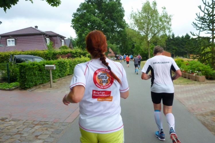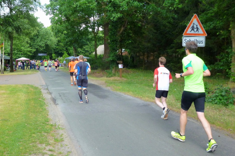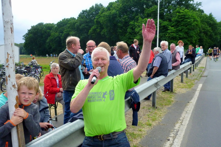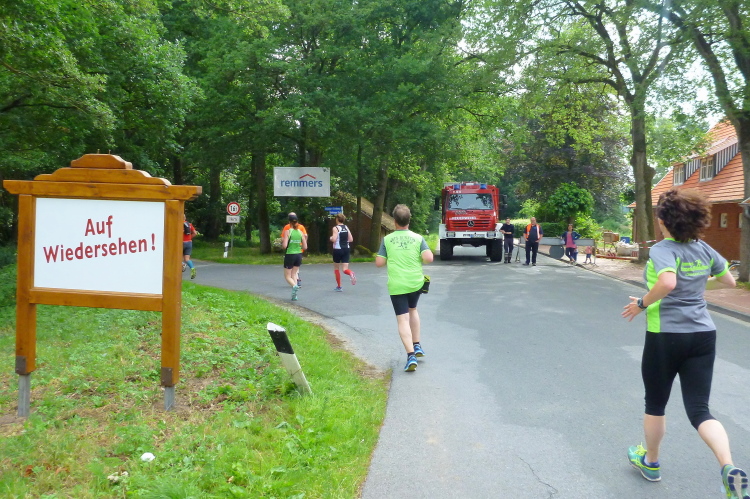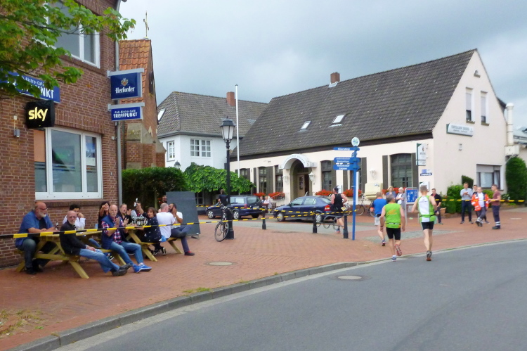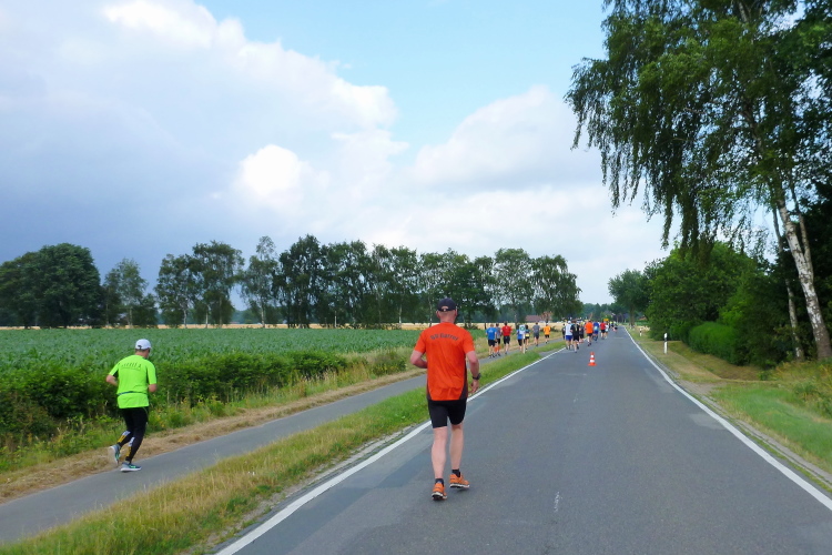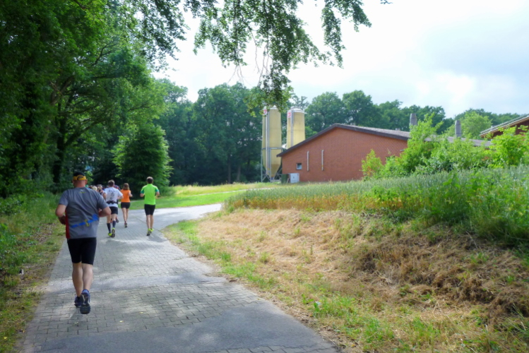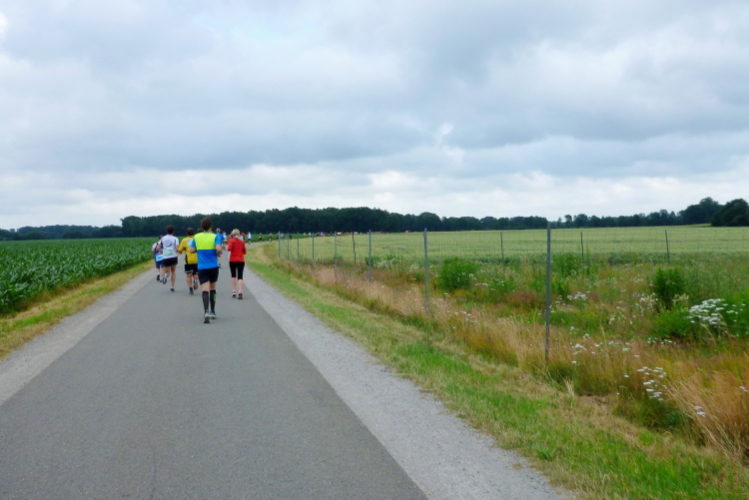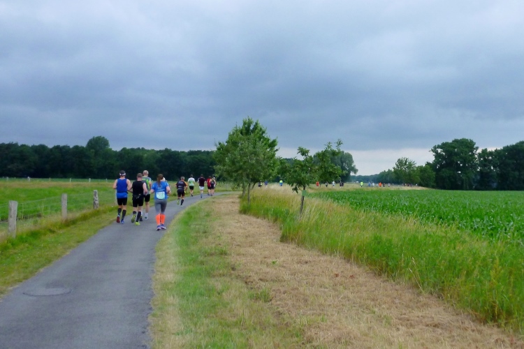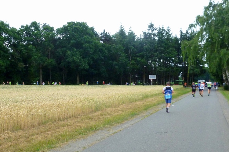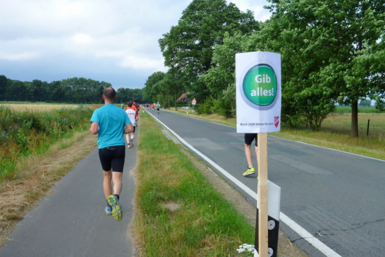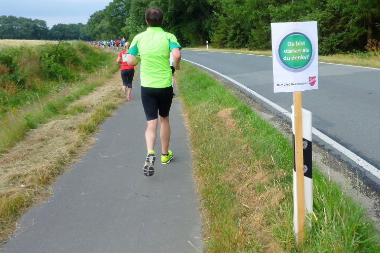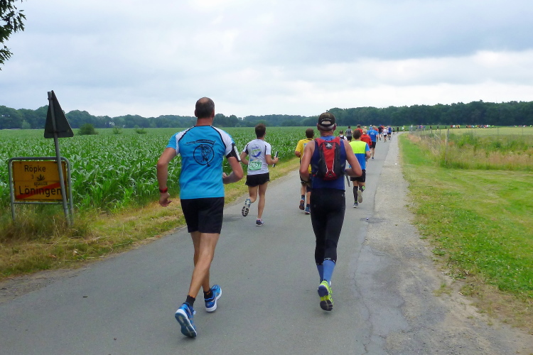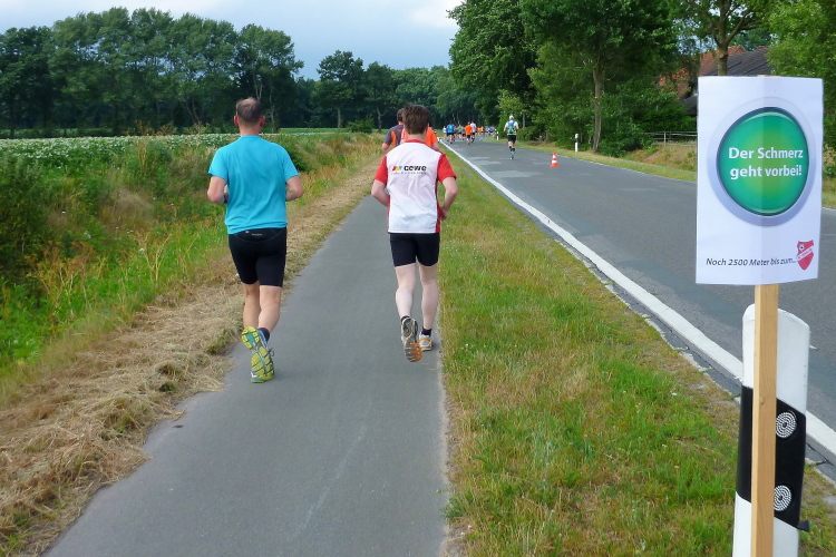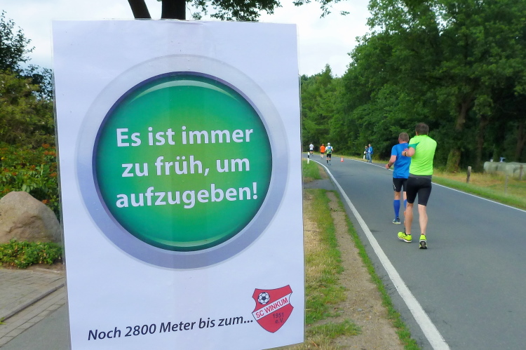 Seit Ehren, wo uns am südlichsten Punkt des Rundkurses durch die Reitsportfreunde eingeheizt wird, bewegen wir uns wieder zurück aus Südwesten in Richtung Löningen. Knapp drei km sind es jetzt auf dem Radweg entlang einer Straße, und damit es nicht zu langweilig wird, hat man alle 100 m einen Spruch inkl. jeweiliger Entfernungsangabe nach Löningen platziert. So vergehen diese drei km dann doch recht flott und in Angelbeck – fast überflüssig zu erwähnen inkl. Moderation und Verpflegung – ist unser Ausgangspunkt im sog. Haseknie nach 13 km fast wieder erreicht. Hier feiern die Anwohner mit dem SC Winkum eine muntere Marathonparty. Das hat mir übrigens schon immer gefallen, ob z.B. in Mannheim, beim Mittelrhein-Marathon und bei vielen weiteren Laufveranstaltungen: Du läufst gutgelaunt und entspannt an zahlreichen Einwohnern vorbei, die es sich vor ihren Häusern gemütlich machen, und sich selbst und die Läufer feiern.