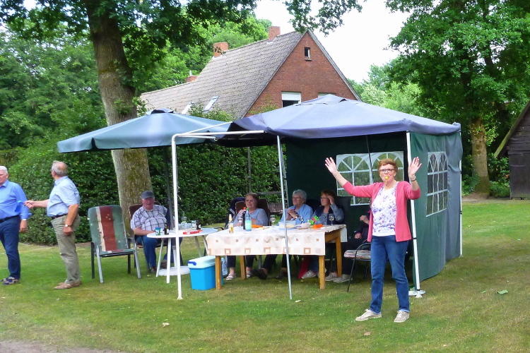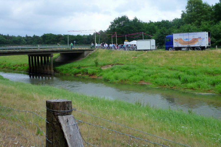 Wieder geht es über weites, landwirtschaftlich genutztes Gelände. Die Gegend ist so flach, daß ich unwillkürlich an den uralten Ostfriesenwitz erinnert werde: Da siehst Du mittwochs schon, wer sonntags zu Besuch kommt. In Röpke kämpft die "Frauenunion Löningen" heute nicht für Angie, sondern erfolgreich gegen unser Verhungern und Verdursten und an der Schelmkapper Brücke macht die SG Böen mit den Streckenmoderatoren Jürgen und Dieter schweren Alarm. Hier überqueren wir wieder die Hase und begleiten diese auf dem Radweg bis ins Löninger Stadtgebiet.