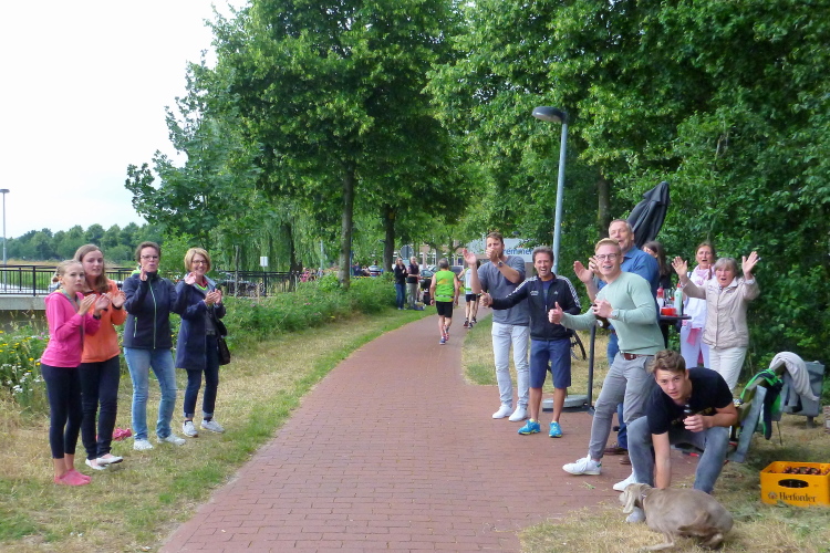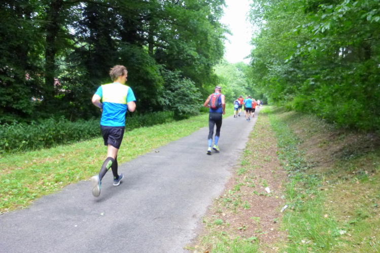 Auf mich wartet derweil eine schöne Überraschung: Während die einlaufenden Halben im Ziel von den knackigen, puschelnden Cheerleader "Flames" empfangen werden, jubelt mir der nicht minder knackige, frisch geduschte Waldbreitbach Lauftreff zu. Das motiviert doch für die zweite Runde, auf der Markus bereits seit einiger Zeit unterwegs ist und die ich jetzt beginne. Naturgemäß verspricht die deutlich einsamer zu werden, denn das Verhältnis zwischen Marathon- und Halbmarathonläufern liegt bei ziemlich genau 1:7 und damit im gewohnten Bereich.