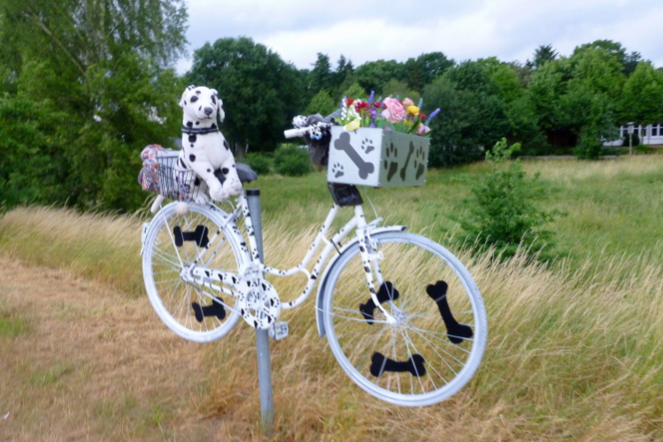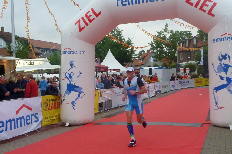 Auf dem Hasedeich „Am Berg“ steigt eine stimmungsvolle Marathonparty, quer über den Weg sind Finishershirts der vergangenen Jahre gespannt. Aber o weh! Zur Verpflegung gibt’s Helene Fischer aufs Ohr, da hilft nur beherzte Flucht nach vorne. Langweilig wird es auch auf den letzten anderthalb km nicht: Am Radweg hat man verschieden dekorierte Fahrräder, eines interessanter als das andere, an Pfählen aufgehängt, ein netter Blickfang. Der letzte km beginnt an einer attraktiven Holzbrücke, dann ist das Stadtgebiet erreicht und durch die Haupteinkaufsstraße geht es zur Streckenteilung: „Marathon geradeaus!“ ruft die gute Streckenpostin (gibt’s das überhaupt? Der Streckenposten, die Streckenpostin?). Ich sehe zwar nicht das Ziel, in der „Krombacherkurve“ jedoch den bekannten Streckenmoderatoren Bernd-Willi Deiters. Der ist nicht nur als fachkundiger Moderator eine Größe: Die Marathonbestzeit des mittlerweile Siebzigjährigen liegt bei beeindruckenden 2:18:28 Std.