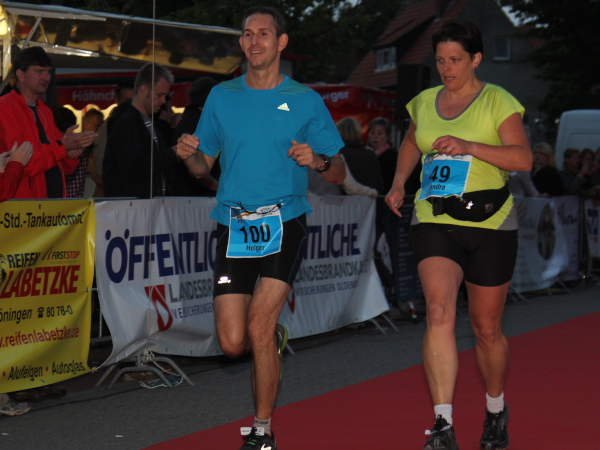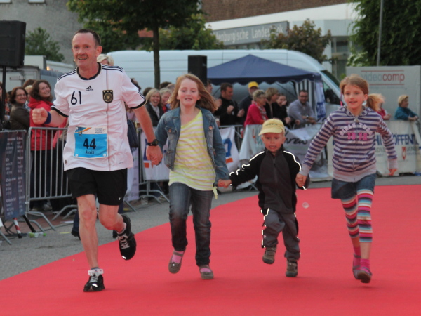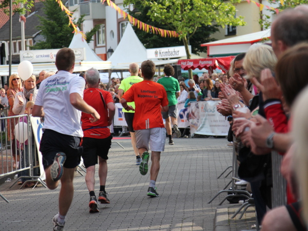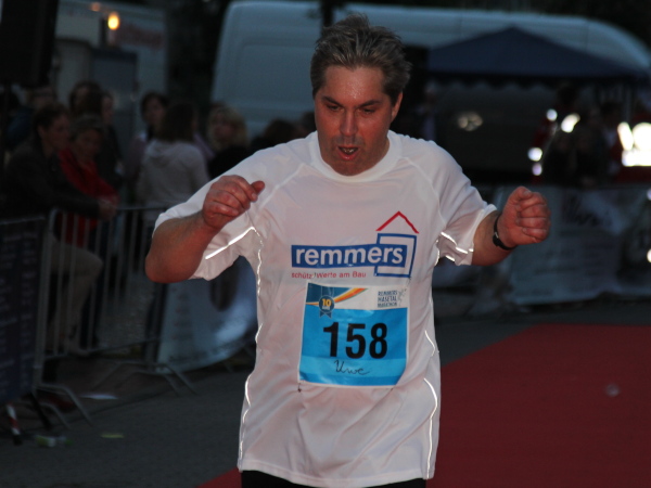 Letzter Kilometer. Kaum hat man den Deich verlassen, ist man im Ort. Nur ein paar Einweiser sind zu sehen. Auch bei der Samba-Gruppe sind kaum Zuschauer, die Straßen sind menschenleer. Ist die Bevölkerung geflohen? Es scheint so. „Letzte Kurve“, heißt es auf einem Schild. Also links rum. Aha, da sind die Löninger – auf dem mit Fähnchen geschmückten Marktplatz. Den Läufern hat man den roten Teppich ausgerollt, Musik spielt, ein Sprecher begrüßt die Finisher. Die Marathon-Night-Party ist in vollem Gange.