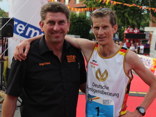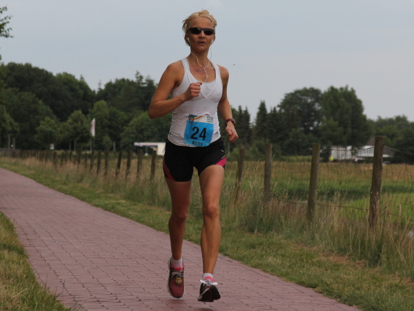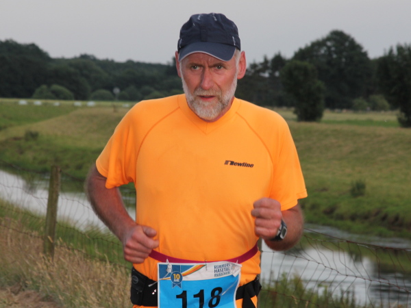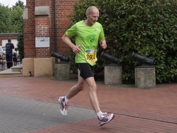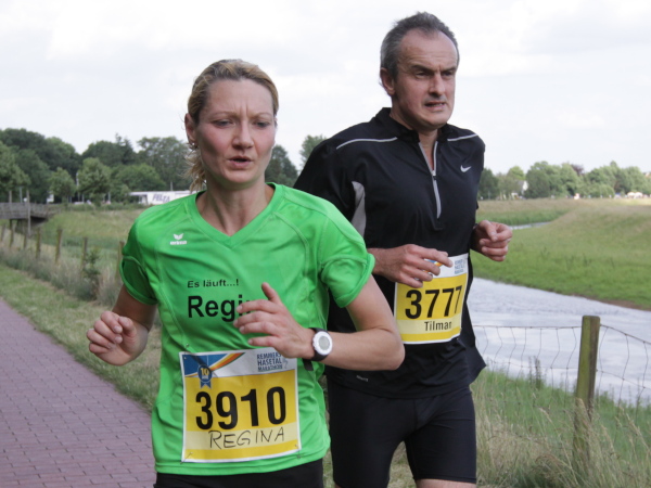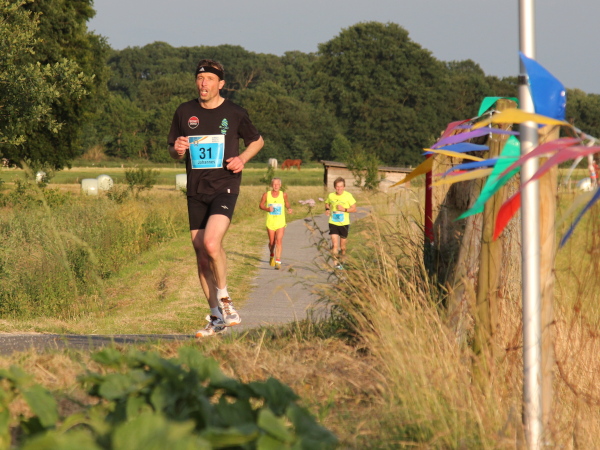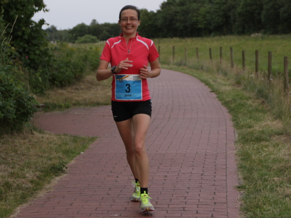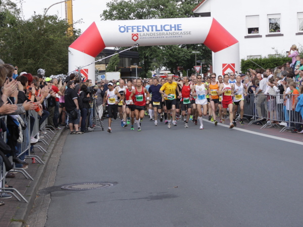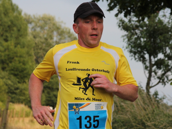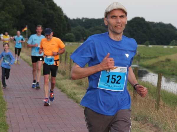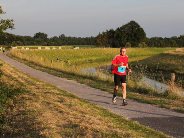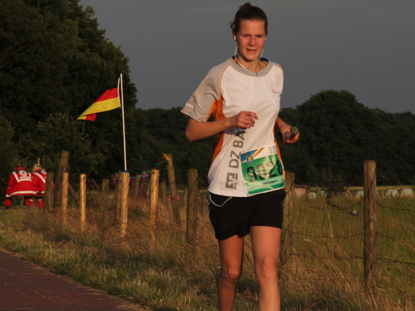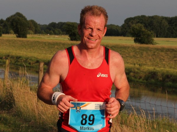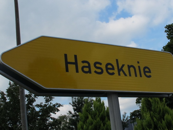 Erst kommt ein kleines Wäldchen, dann geht es bei km 7 über das Flüsschen, das dem Lauf den Namen gibt: die Hase. In der Nähe von Osnabrück ist die Quelle, in Meppen die Mündung in die Ems. Durch Wiesen und Weideflächen zieht sich das Asphaltband, topfeben und 1000 m fast schnurgerade. Gut für einen Zwischenspurt.