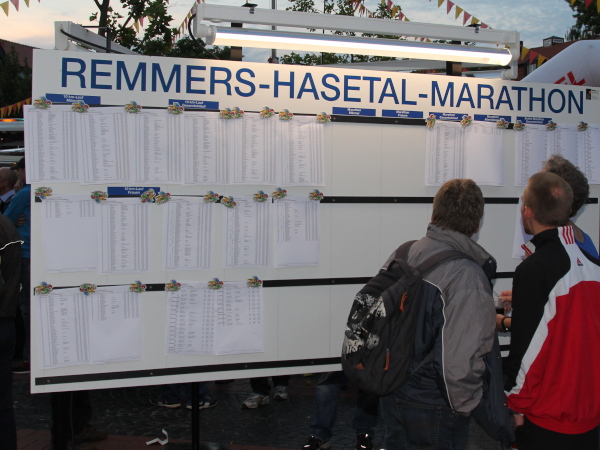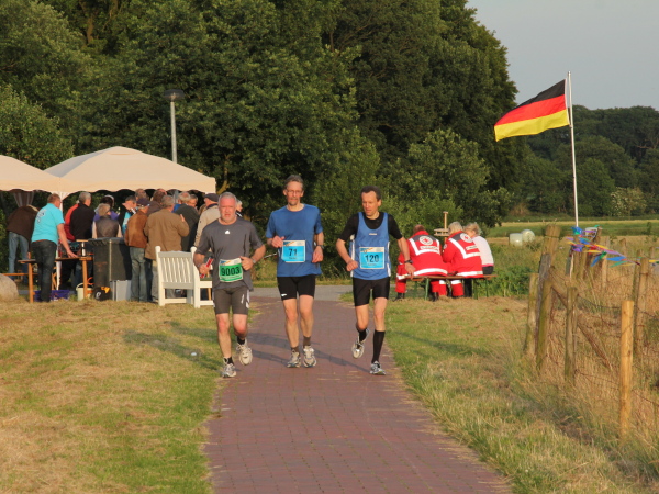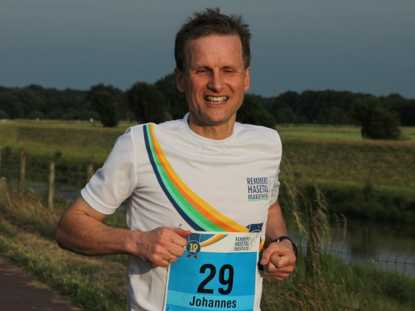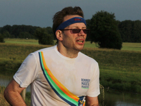 Und dann die Idylle. Genusslauf pur entlang der Hase. Eine Schafherde und ein paar Angler, sonst ist niemand zu sehen. Nur 1000 m geht das so. Dann sieht man ein weißes Partyzelt, wenig später hört man Musik und Jubel. Die nächste Feier.