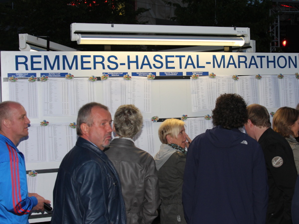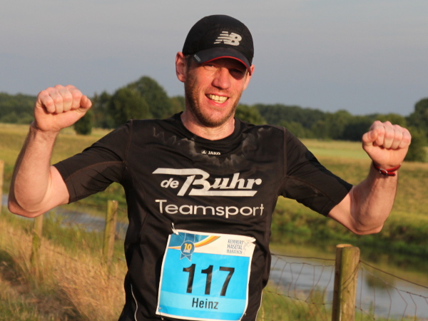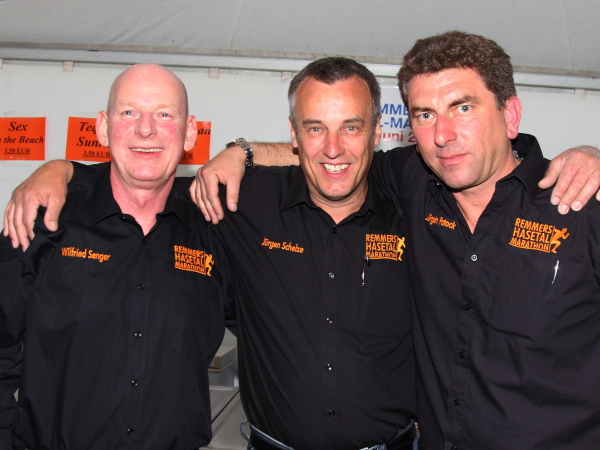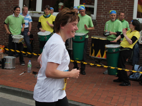 Wieder 1000 m zum Tempo bolzen. Dann rechts auf den Sackmoorweg. In einer Scheune wird gerockt. Aber wie. „El Camino“ samt Fans heizen den Marathonis ein. Kaum sind die harten Klänge von hinten verstummt, gibt’s Schlagermusik von vorne. Auf der Hüe spielen „once more“. Das gefällt nicht nur den Läufern, sondern auch den vielen Zuschauern. Dann ist aber Pause …