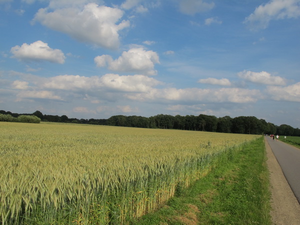 Die beim Feiern vertrödelte Zeit kann man auf den nächsten drei Kilometer gut wieder reinholen. Es geht auf einem Radweg parallel entlang der Verkehrsstraße. Autos fahren hier aber keine. Rechts und links Getreidefelder, eingestreut mal ein Bauernhof, über uns blau-weißer Himmel. Städter werden mit völligen neuen Gerüchen konfrontiert, denn der Bauer hat wohl am Morgen noch schnell gedüngt.