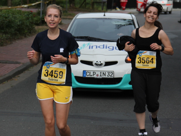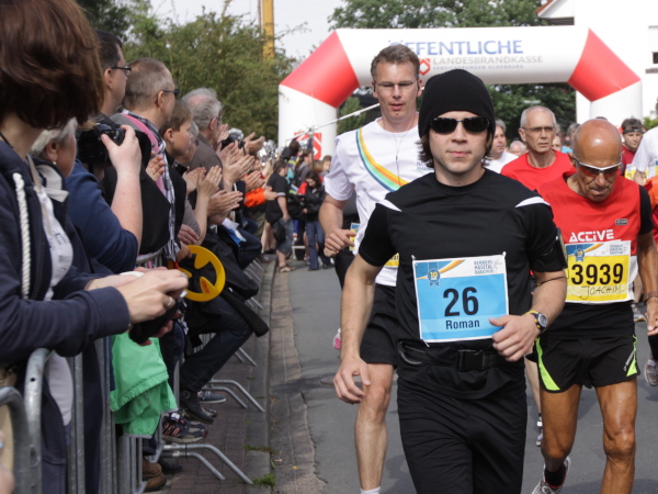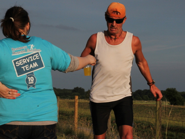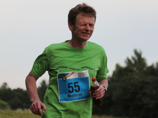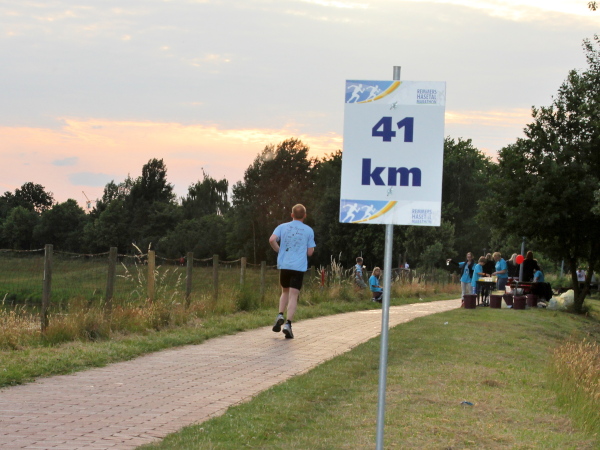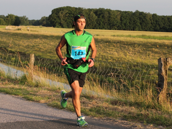 Irgendwann kommt bei jeder Strecke der Punkt, wo man mental etwas gefordert wird. Jetzt zum Beispiel, bei km 15. Man sieht nichts als weite Getreidefelder und vor sich dunklen Wald. Schaut man genau hin, erkennt man links die Läufer als bunte Punkte. Gut drei Kilometer ist die Schleife, die man am Waldrand entlang läuft, nur einmal aufgemuntert von einer kleinen Zuschauergruppe und den putzmunteren Mädels an der Getränkestelle.