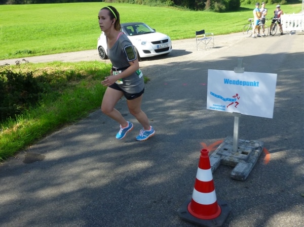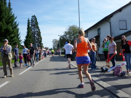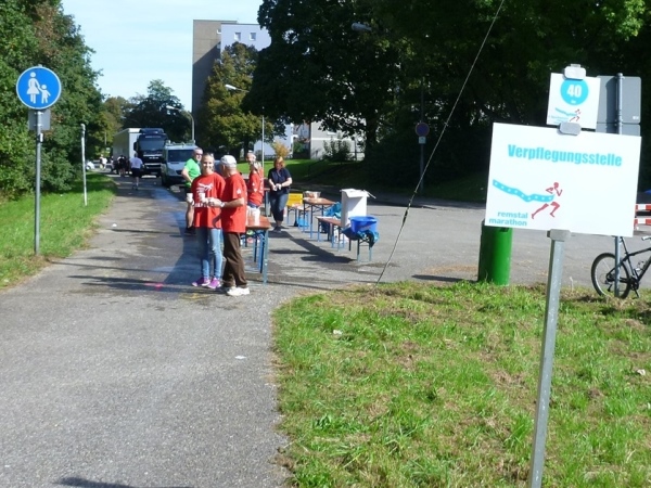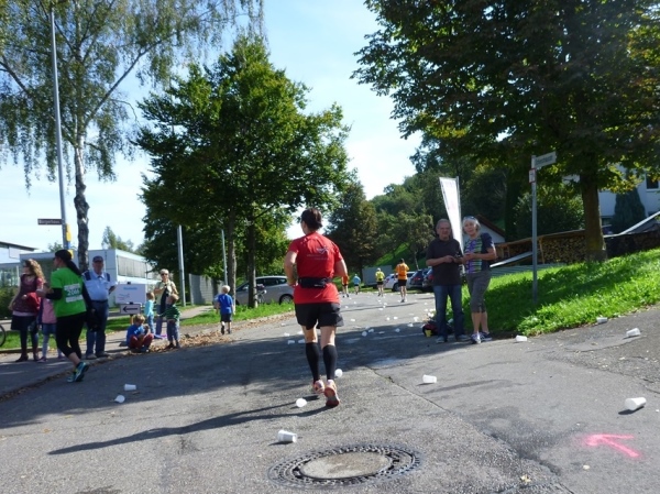 Schneller als gedacht nähern wir uns Urbach und damit dem Ziel des Halbmarathons, für mich Halbzeit und Gelegenheit zur Bestandsaufnahme. Gut entzerrt hat man hier die Läuferschar, links die Marathoner, rechts die Halben, und dahinter erst der Staffelwechsel.