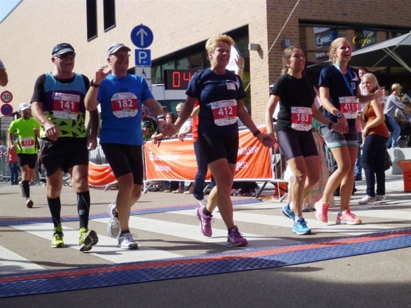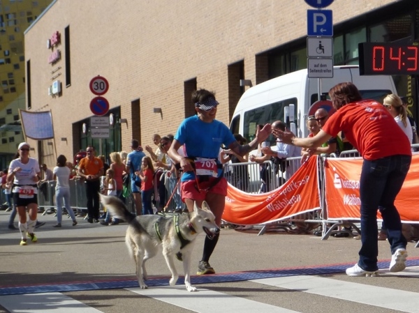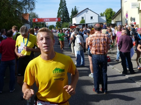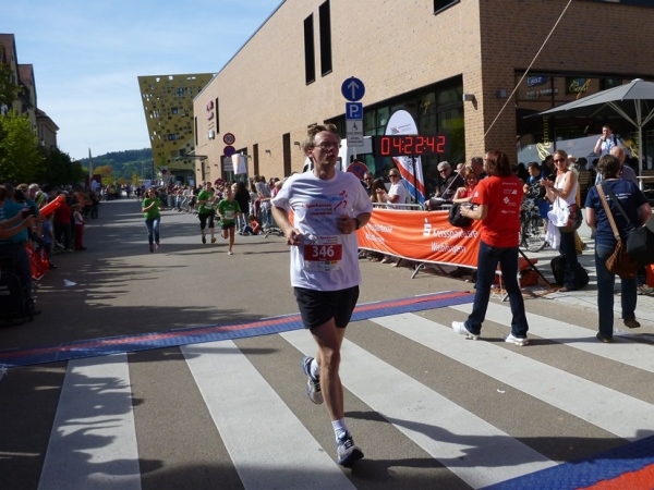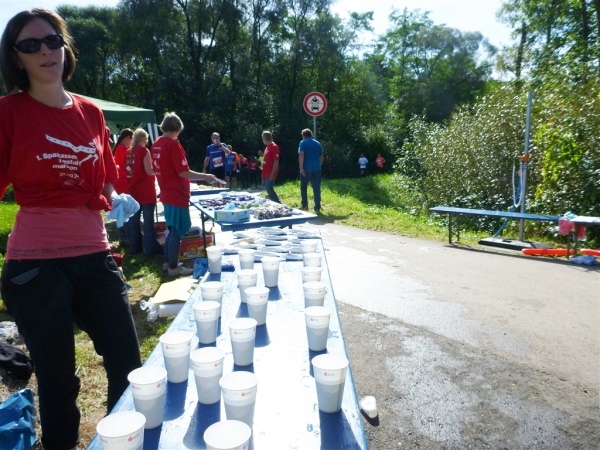Noch 1.000 m, Erleichterung macht sich bei mir breit. Ich werde durch ein Tor geleitet und auf den offensichtlich zentralen Bereich der gerade stattfindenden Landesgartenschau geleitet. Wow, was wurde hier im wahrsten Sinne des Wortes bewegt, wie viel hat sich verändert! Für mich im Vorbeilaufen nur zum Positiven, das ist ein toller letzter km. Applaus begleitet mich im Zulauf auf das rote Zieltor und dann kommt der Hammer. Wie nennt man einen weiblichen Conférencier? Conférencieuse? Keine Ahnung, egal, die Frau ist klasse! Was die für einen Alarm macht, und das für jeden Läufer, für jede Staffel, das ist einfach großartig. Zwei hübsch kostümierte Damen verteilen ebensolche Medaillen, ich aber setze mich nach drei Bechern Bouillon (ich habe unterwegs tatsächlich ausschließlich Wasser getrunken, das geht also) an den Zaun, warte auf Thorsten und genieße mit wachsender Begeisterung die Frau am Mikro und als Thorsten da ist, die Zielverpflegung mit gut gekühlten (!) Getränken.