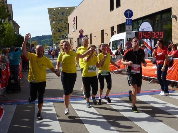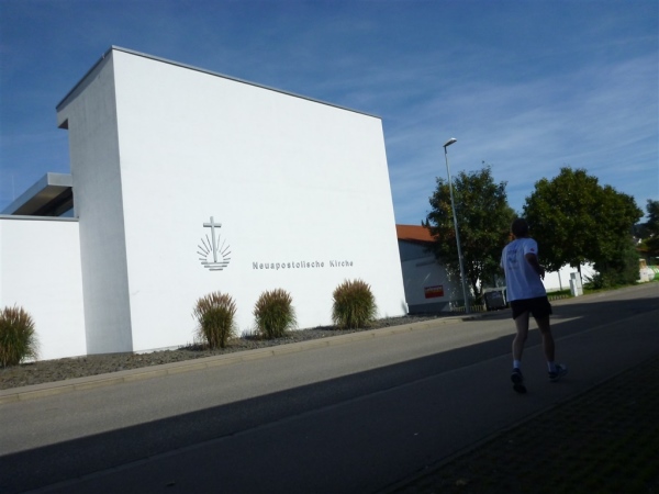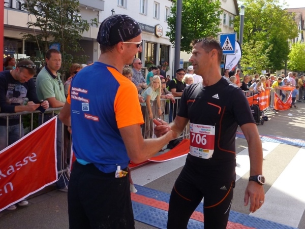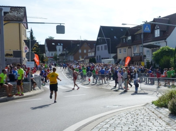 Es verkehrt zwar ein Bus zur Sporthalle, in der die Gepäckrückgabe stattfindet und auch geduscht werden kann, wir aber bevorzugen hinzugehen und die feste Muskulatur etwas zu lockern. Wie immer ist das zwar schmerzhaft, der Erfolg aber am Folgetag spürbar bzw. eben weniger spürbar. In der Dusche erfolgt noch ein weiterer DRK-Einsatz, selbst hier gibt’s noch Kreislaufprobleme. Es ist halt ein wirklich warmer Tag. Für die Rückfahrt nach Waiblingen wird ebenfalls ein Bus angeboten, der allerdings für die rund 40 km fast anderthalb Stunden benötigt, weil er an jedem Misthaufen anhält. Ich meine, daß die meisten wohl an den Start zurückwollen und empfehle daher für das nächste Jahr den direkten Weg zu nehmen. Wir haben Glück, Thorstens Frau liest uns auf und nimmt uns mit zurück. So kommen wir auch noch in den Genuß, den zentralen Marktplatz Schwäbisch Gmünds wiederzusehen, den sie ganz toll herausgeputzt haben.