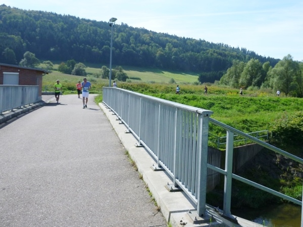 2:08 Std. sind vergangen, damit bin ich recht gleichmäßig unterwegs und bewege mich in seit vier Monaten nicht mehr erlebtes Terrain, denn 21,1 km waren in dieser Zeit tatsächlich mein längster Lauf gewesen. Ist Grund zum Optimismus vorhanden? Nun ja, ich laufe meinen, wenn auch gemächlichen Stiefel herunter, merke meine Beine zwar, aber noch nicht dramatisch. Wirklich Sorge bereitet mir das völlig vernachlässigte Training des Fettstoffwechsels. Was wird sein, wenn die Kohlehydratspeicher erschöpft sind? Nach wie vor halte ich mich, ohne groß darüber nachzudenken, an den Verpflegungsstellen nur an Wasser.
