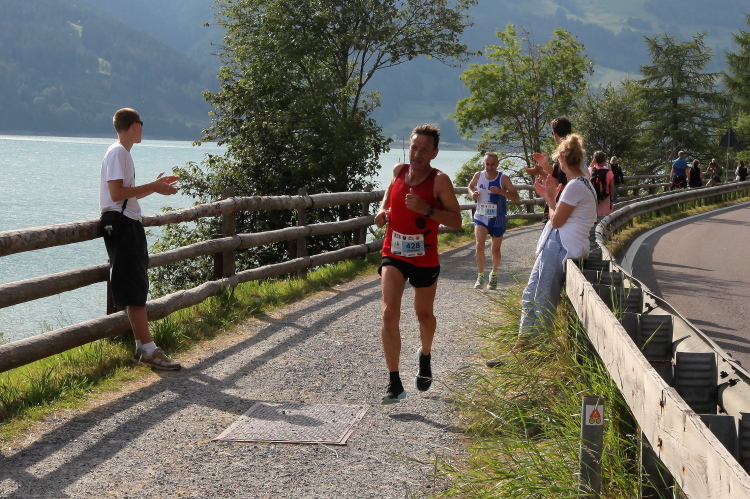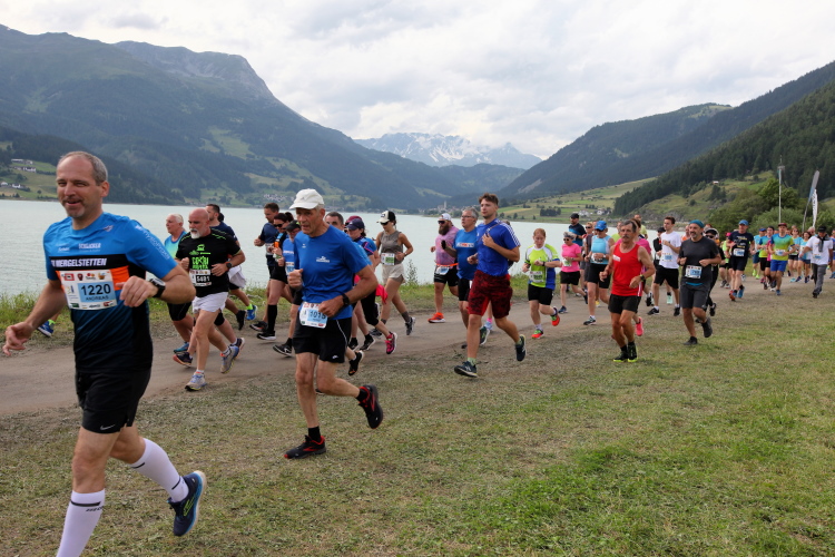 Um 17.00 Uhr wird dann in mehreren Gruppen der Hauptlauf gestartet. Fotografen drängen sich im Startbereich, als gelte es, die ganz großen Marathonstars abzulichten. Und dann die Zuschauer. Ich wette, dass es mindestens 4mal so viele wie Läufer sind. Die Laufstrecke umd den See ist traumhaft, aber besonders auf der Westseite nicht ganz flach. Der Blick auf den schneebedeckten Ortler, mit 3905 m der höchste Berg in Südtirol, ist sagenhaft.