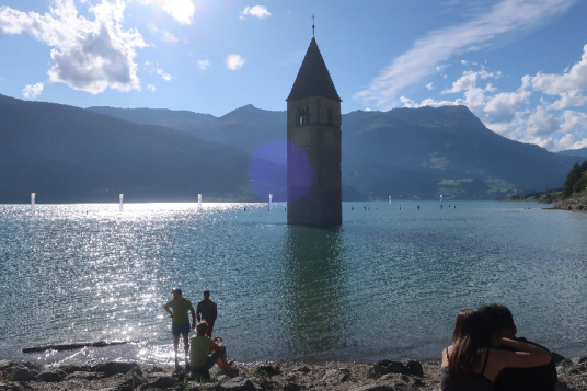 Angesichts des schönen Sommerwetters spielt sich das Treiben am Nachmittag freilich vornehmlich im Freien ab. Spaß macht es, sich über das Gelände treiben zu lassen, das Ganze auch mal ganz entspannt aus der Vogelperspektive von dem erhöht auf einem steilen Hügel gelegenen Kirchlein St. Anna zu betrachten oder sich im Halbrund der Grauner Bucht am Ufer mit Blick auf den 700 Jahre alten Kirchturm der einstigen Pfarrkirche St. Katharina, dem Wahrzeichen des Sees und der Region schlechthin, zu sonnen. Über einen fahnengesäumten Naturdamm kann man die Grauner Bucht sogar per pedes umrunden. Allerdings ist der Wasserstand heute nicht so niedrig, dass das trockenen Fußes möglich wäre.