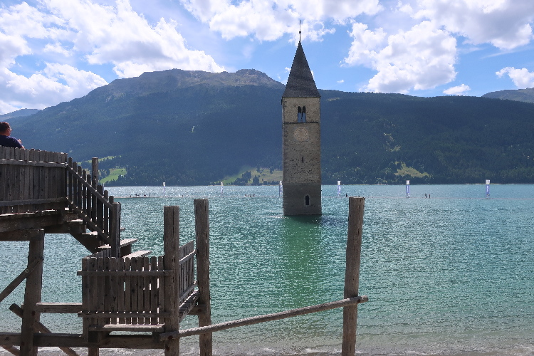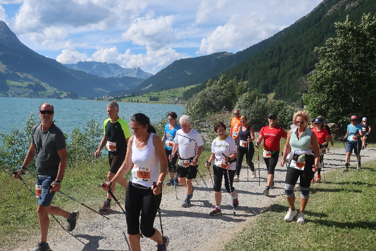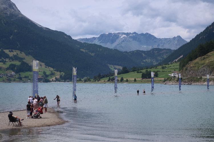 Nach 4,5 km ist ein Highlight des Streckenkurses erreicht: Die Staudammmauer, der der See seine nunmehr 75 Jahre währende Existenz verdankt. Grandios ist das Panorama vom schnurgerade über die 415 Meter lange Mauer führenden Weg: Zur Rechten der berggerahmte, hier in voller Länge überblickbare See, zur Linken und fünfzig Meter tiefer gelegen der kleinere Haidersee mit dem Dorf St. Valentin, am fernen Horizont überragt vom fast viertausend Meter emporragenden Ortlermassiv. Allerdings ist es nach 22 Uhr und damit ist dieses Panorama nur ein theoretisches.