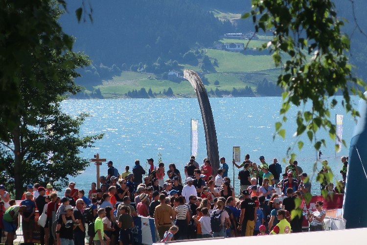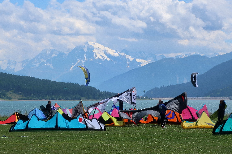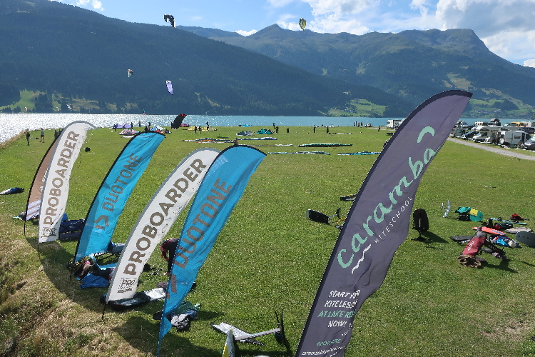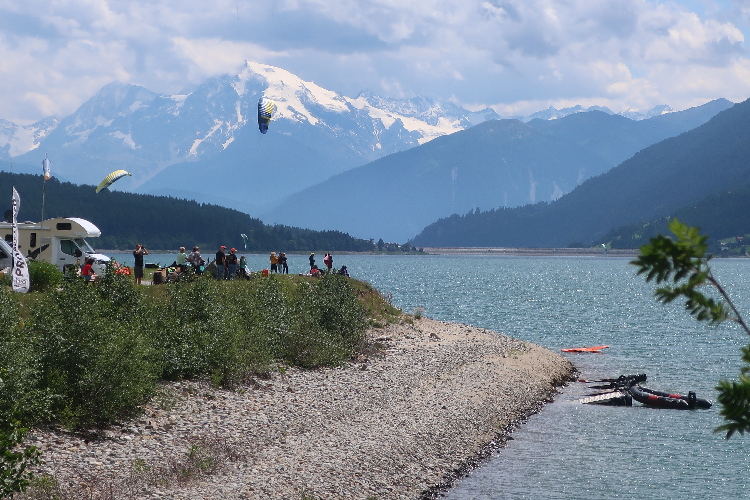 Schon am Freitagnachmittag läuft sich die Veranstaltung mit Festbetrieb auf dem weitläufigen Freigelände am westlichen Seeufer „warm“, aber so richtig los geht es am Samstag. Motorisiert via SS40 über den Reschenpass kommend trudeln wir erst am Samstagnachmittag ein. Die weiten Wiesen südlich des Veranstaltungsgeländes, gleich neben der Kite-Surfer-Zone am See, sind zu einem überaus großzügig dimensionierten Parkplatz umfunktioniert, zu dem es allerdings nur eine Zu- und Abfahrt gibt.