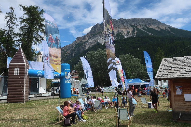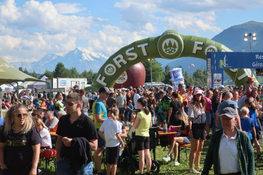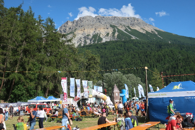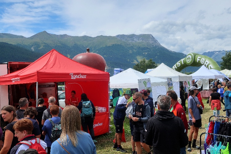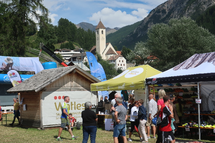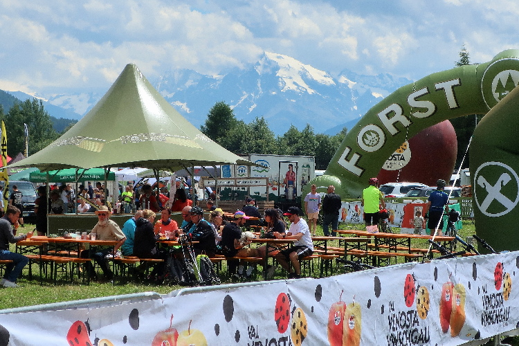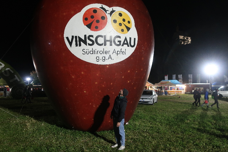 Nach der Pflicht die Kür: Und rein geht es ins Festgelände. Um die sechzig Buden und Stände sollen es sein, die sich über die Wiesen verteilen. Klar, dass bei einer solchen Veranstaltung Anbieter von Laufequipment reichlich vertreten sind. Aber zahlreiche Angebote sind auch kulinarisch ausgerichtet. Lokale Spezialitäten stehen im Vordergrund: Schnäpse und Weine, Öle und Säfte, Speck und Käse. Die längste Schlange bildet sich allerdings dort, wo es etwas umsonst gibt: Beim Waffelhersteller Loacker. Nichts kosten auch die aufgeschnittenen Südtiroler Äpfel gleich nebenan.