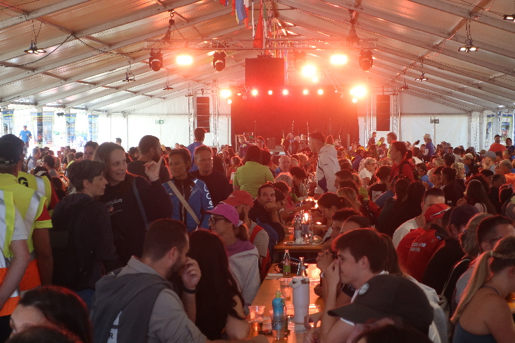 Hier ist man dann aber bereits am Eingang des Festzelts. Gewaltig sind die Dimensionen des Zelts. Die eine Längsseite ist voll in der Hand der Gastronomie: Schnitzel, Fischteller und Einiges mehr bekommt man hier, Pasta natürlich auch. Und ein üppiges Kuchenbuffet dazu. Auf der gegenüberliegenden Seite führt etwas erhöht ein Laufsteg durch das gesamte Zelt: Hier muss später jeder Läufer schaulaufen, bevor er fünfzig Meter weiter unter dem Zielbogen finisht.