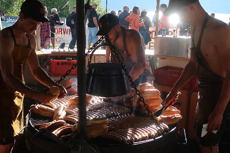Nahtlos geht der Buden- in den Biergartenbereich über. Zahllose Tisch- und Bankgarnituren verteilen sich über das Gelände. Leckerer Bratwurstduft liegt hier in der Luft. Oberkörperfreie Burschen betreuen einen riesigen wurstüberladenen Grill. Das passende Bier dazu gibt es gleich nebenan. Fast schon ein wenig verloren wirkt da die mobile Kaffeebar am Rand.