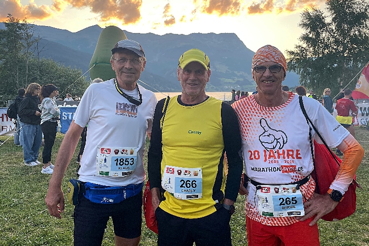 Erschöpft und erleichtert quere ich die Ziellinie. Patrick wartet hier schon geduldig seit einer halben Stunde und nimmt mich in die Arme. Als Gelegenheitsläufer ist er in 1:19 Std. um den See herum geprescht – ich bin beeindruckt. Eine herzerwärmende Begrüßung ist das und ich freue mich mit ihm über unser beider Finish. Eine aufwändig gestaltete Jubiläumsmedaille und ein zusätzliches Verpflegungssackerl gibt es als Belohnung für die, die es ins Ziel geschafft haben.