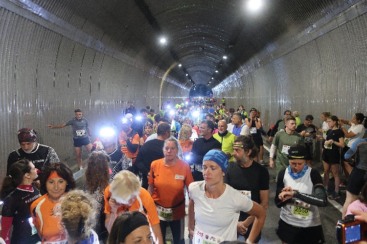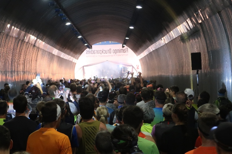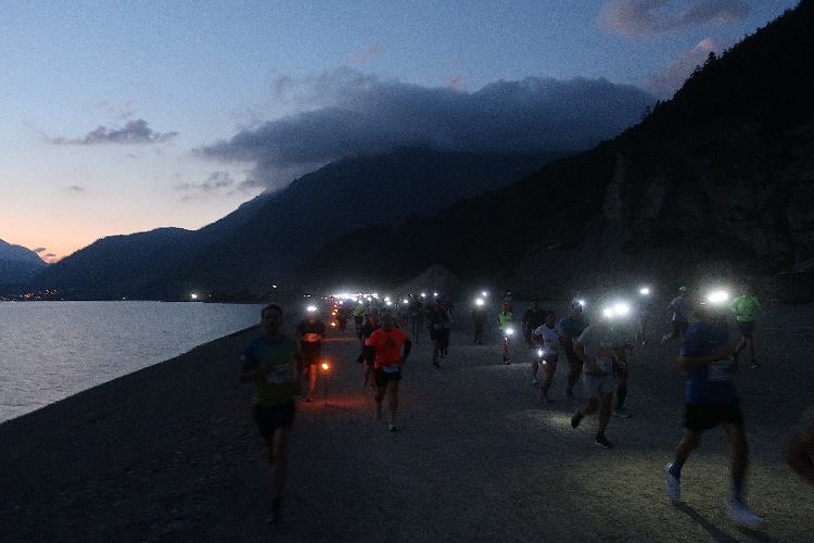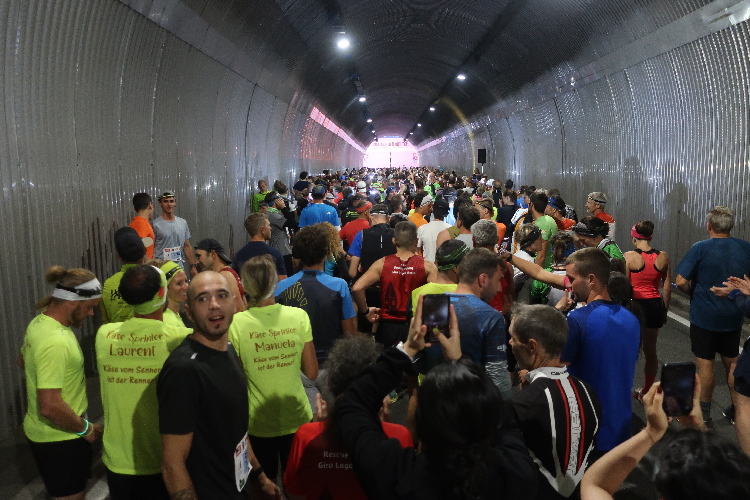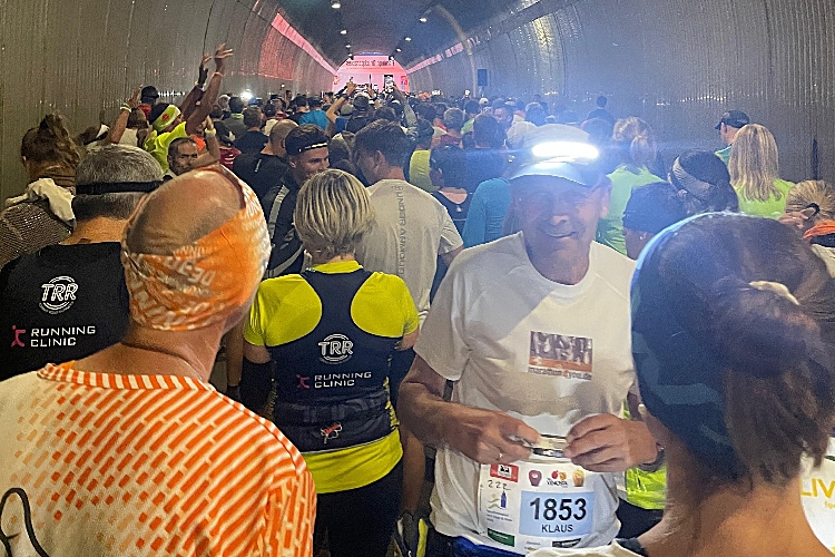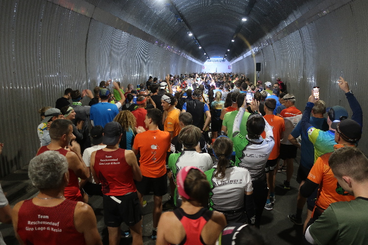 Wehe allerdings, wer sich jetzt zu lange Zeit lässt, noch eines der raren stillen Örtlein zu suchen oder sein Gepäck abzugeben. Denn lange Schlangen machen das Warten hier zur Geduldsprobe. Um kurz vor halb zehn Uhr reihen wir uns ein in die Karawane jeder, die zum Startpunkt zieht. Und der ist, eine Besonderheit des Jubiläumslaufs, nicht wie üblich direkt beim Festgelände am See, sondern auf der am See vorbeiführenden SS40, konkret im Tunnel zwischen der Lagune von Alt-Graun und dem Dorf Graun. Ab 21:30 Uhr werden die Läufer hier zeitversetzt in vier im Vierminuten-Intervall startenden Blöcken auf die Strecke geschickt, wobei man den Block frei wählen kann. Eine klare Blockeinteilung lässt sich aber gar nicht erkennen und so finden wir uns auf einmal mitten im Gewühl Hunderter Starter im Inneren der Tunnelröhre wieder.