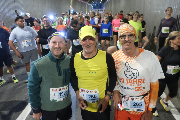 Hunderte Zuschauer lauern am Tunnelausgang und feuern die aus dem Tunnel stürmenden Läufermassen enthusiastisch an. Ich klopfe Patrick auf die Schulter, wünsche ihm einen guten Lauf und signalisiere ihm, Gas zu geben. Als „guter Sohn“ wollte er seinen alterslahm gewordenen Dad begleiten. Aber das wäre eben nur der halbe „Fun“ für ihn. Und so bin ich und wohl auch er froh, dass jeder das nächtliche Laufabenteuer nach seinem Gusto und Vermögen gestalten kann.